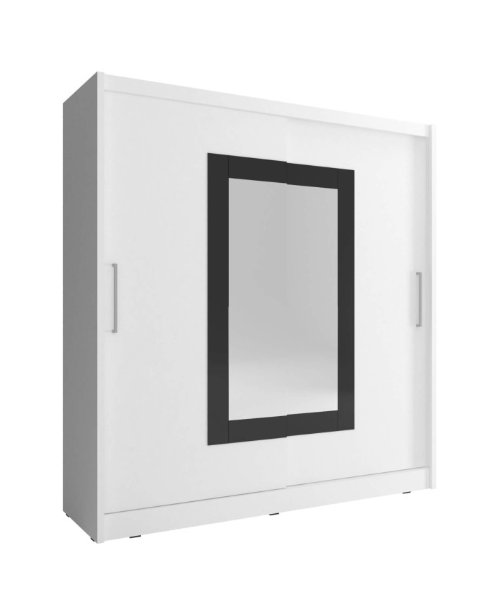 The attractive Wiki 2 mirrored wardrobe in a matte white finish, measuring 200 cm wide, will fit seamlessly into almost any furnishing style: contemporary bedrooms, living rooms, parlors, hallways, and even teenagers’ rooms. Thanks to its sliding doors, it requires minimal space for safe, comfortable use. It features two large mirrors located on the inner edge of the door, the edges of which are highlighted with an elegant black ornament. In addition to their obvious function, the mirrors visually enlarge the room. The interior is equipped with ample shelves for clothing and large boxes, as well as a hanging rail for long and short clothes. The wardrobe is made of laminated furniture board in a matte white finish, characterized by increased scratch resistance. The furniture is delivered as a self-assembly unit with easy-to-follow instructions and hardware included.