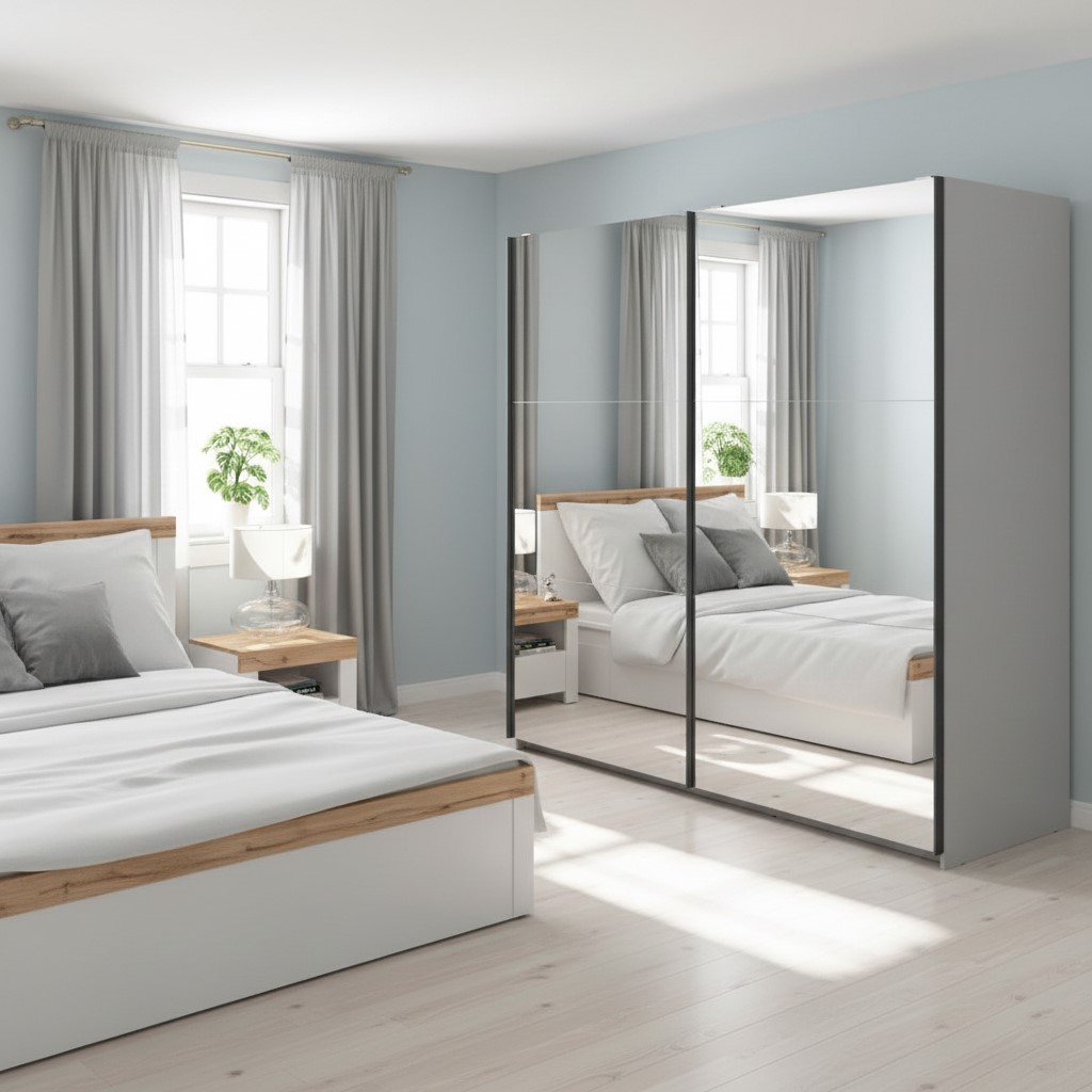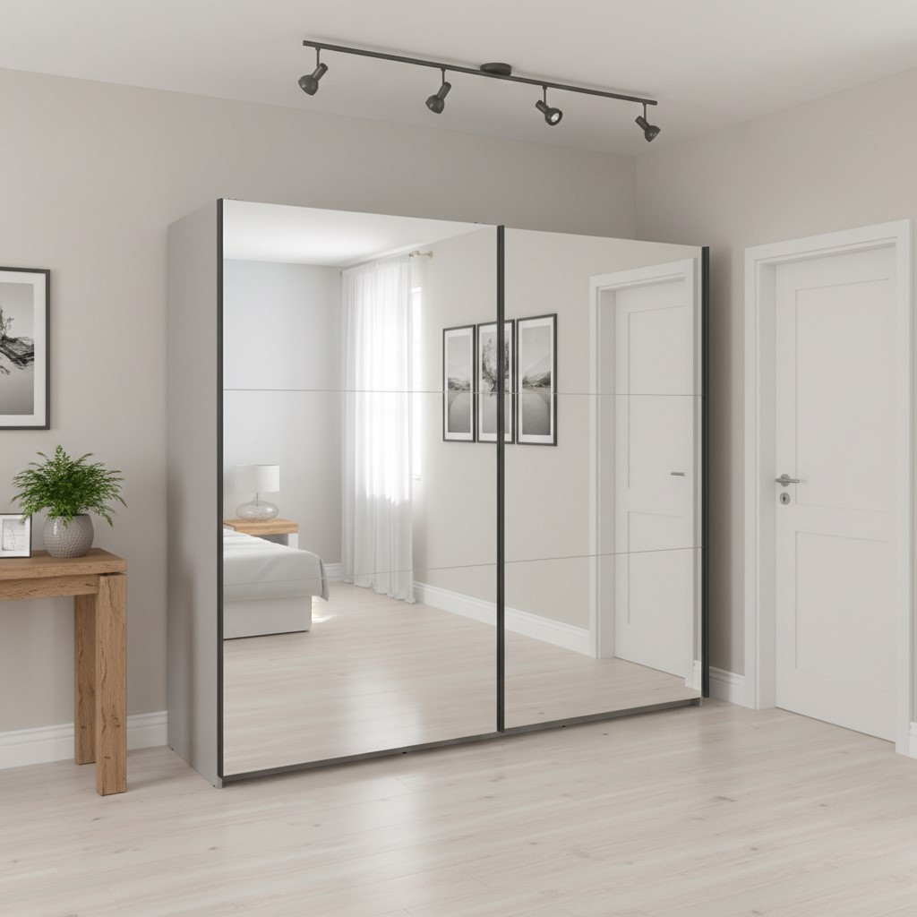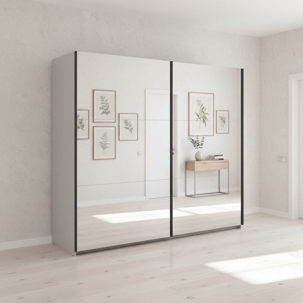 The Tetrix 220 Sliding Wardrobe – Functional Wardrobe Space. The Tetrix collection combines modern style, functionality, and elegance. Finished in a timeless cashmere color, the furniture blends seamlessly with a variety of interior designs, creating an aesthetically pleasing and organized space in a bedroom, dressing room, or youth room. Functionality and Configuration: The Tetrix 220 Sliding Wardrobe is designed with ergonomics and everyday comfort in mind. Its large capacity allows you to easily organize clothes, textiles, and accessories. Two sliding, mirrored fronts not only facilitate access but also visually expand the space. Inside, you’ll find two hanging rails, perfect for storing shirts, jackets, or dresses, and two deep upper shelves for less frequently used items. The standard system also includes six additional shelves that you can freely configure. If you need more space for hanging clothes, simply remove them. The gray linen interior offers an elegant and modern look, highlighting the high quality of its craftsmanship. The wardrobe is made of durable laminated board, resistant to everyday use. The stated depth does not include fronts with handles, which is worth considering when planning your space. Special features: dimensions: depth 60 cm, width 220 cm, height 195.5 cm, color: cashmere, 2 sliding mirrored fronts, 2 hanging rails, 2 deep upper shelves, 6 additional removable shelves, gray linen interior, shelving layout can be customized, available in a variety of colors, laminated board resistant to everyday use. Summary: The Tetrix 220 sliding wardrobe is the perfect solution for those who value order, elegance, and functionality. Thanks to its well-thought-out interior and modern mirrored fronts, it will become a practical and stylish element of your bedroom.