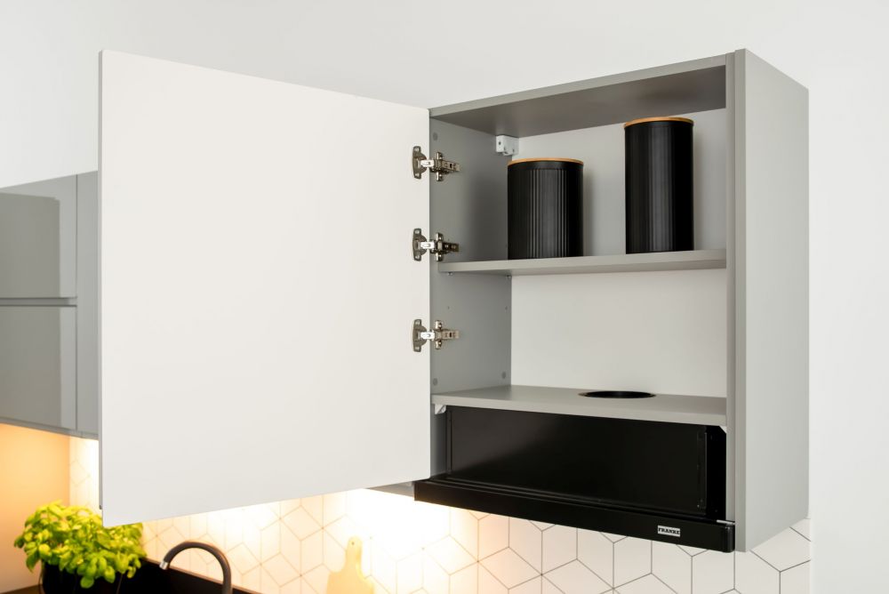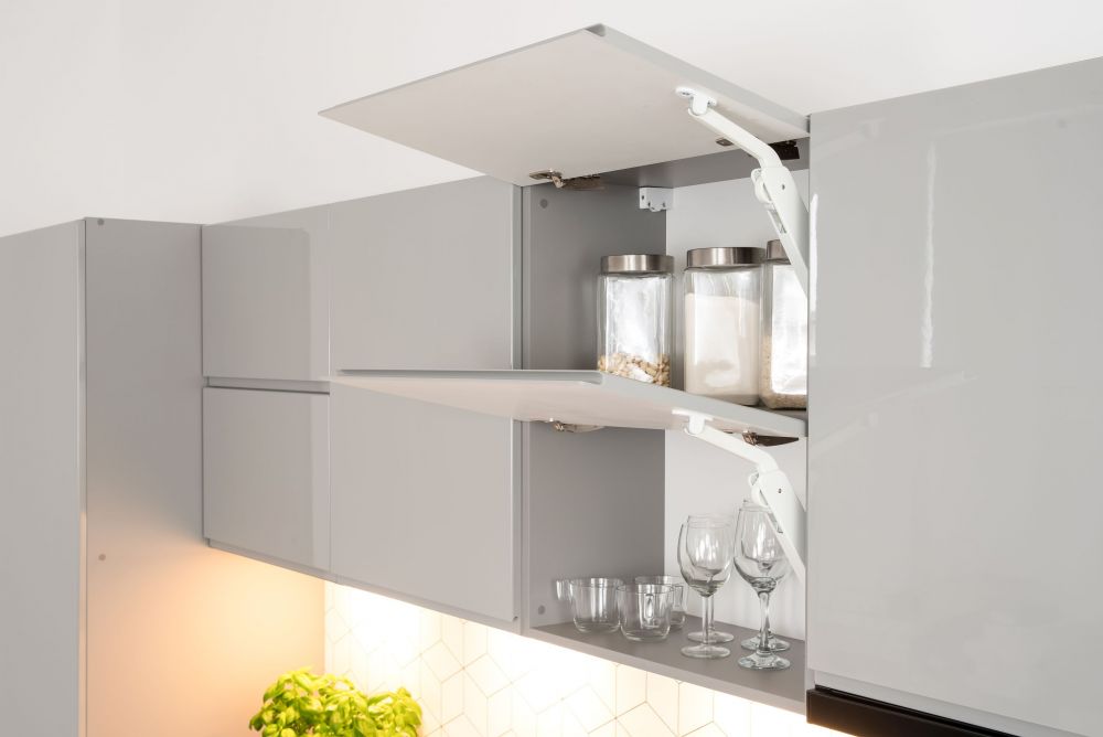 Cabinets with swing-out fronts have adjustable lifters