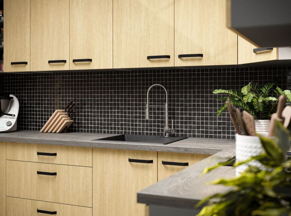 The Scandi kitchen is a set of highly practical and beautiful furniture. The system consists of dozens of cabinets – Scandinavian-style kitchen furniture. The cabinet fronts feature a solid herringbone pattern. A wide selection of countertops. Solid handles add character to the furniture and facilitate access to the products stored within. They perfectly complement the overall set. Parameters: