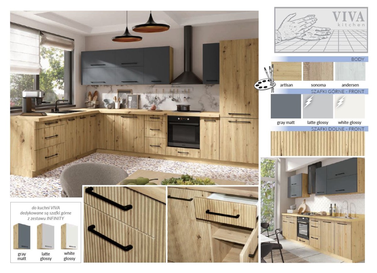 The Viva kitchen is a modern and ergonomic set of kitchen furniture characterized by: