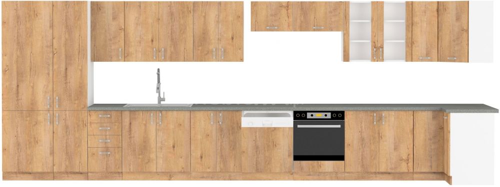 The Sara Lefkas Oak Kitchen is a kitchen furniture set whose simple, lightweight shapes and bright, fashionable colors will complement any modern interior, while the horizontal, light grain will visually enlarge any small kitchen.