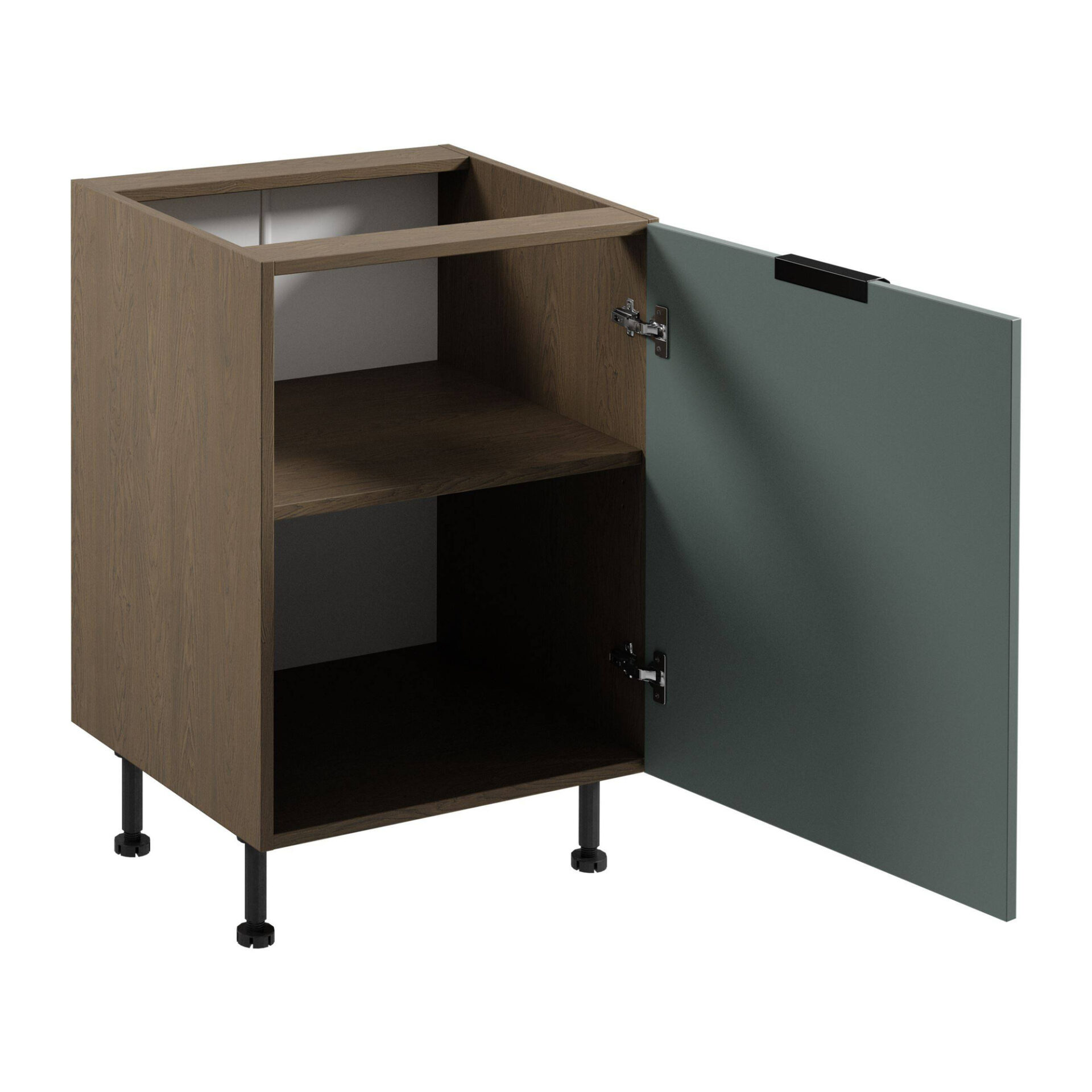 Discover a new level of quality in your kitchen with the Sorento D60 base cabinet in Baltic Storm Green from Gała Meble. This elegant, green design element captivates with its subtlety, creating a unique atmosphere in your space. The matte green front brings a touch of calm and harmony to the interior, perfectly complementing natural materials like wood and stone, making your kitchen a place of true relaxation and inspiration. The Sorento D60 offers not only aesthetics but also comfort. Clip-On hinges with a soft-close function work to your advantage, ensuring smooth, almost silent closing, an invaluable advantage in everyday use. Add to this a convenient black metal handle, and you have a cabinet that combines functionality with modern design. The cabinet body has been designed with attention to detail. The laminated board in Baltic Storm not only catches the eye but is also damage-resistant, ensuring its longevity. Adjustable legs with a height of 15 cm allow you to adjust the height of the cabinet to your individual needs, providing you with greater arrangement flexibility.