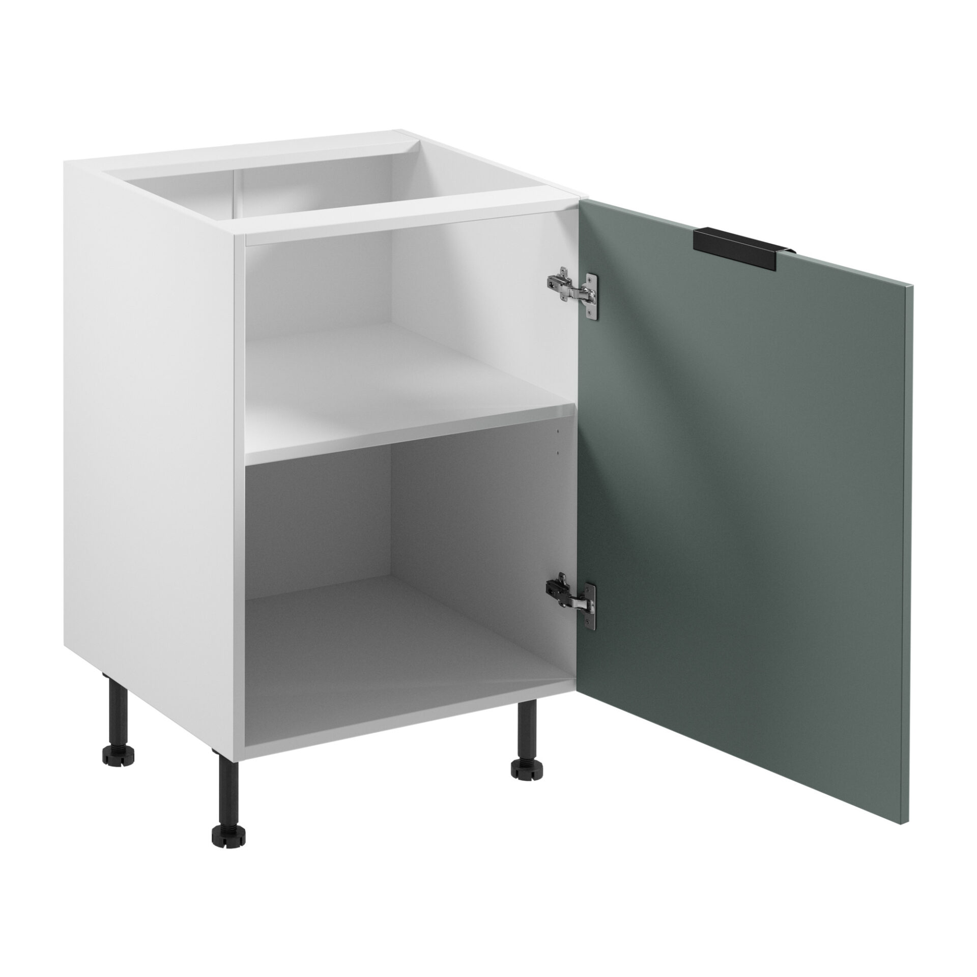 Introducing the Sorento 1-D Base Kitchen Cabinet, perfect for those looking to create a spacious and modern kitchen. With its elegant combination of matte white and green, this piece will not only practically fill any available space but also add a touch of freshness and character. Its minimalist design makes it a perfect fit for a variety of interior styles, both modern and more classic. This type of cabinet is more than just a useful piece of kitchen equipment. The tall, 15 cm adjustable legs give it an elegant and modern look while also facilitating daily cleaning underneath. High functionality and aesthetics go hand in hand, making using the cabinet a pure pleasure. The cabinet is made of durable laminated board, ensuring its resistance to everyday wear and tear and ease of cleaning. Thanks to the use of Clip-On hinges, the cabinet features a soft-close system, which will certainly be appreciated by those who value comfort in the kitchen. The black metal handle adds modern elegance and is comfortable to use, which increases the comfort of everyday kitchen activities.