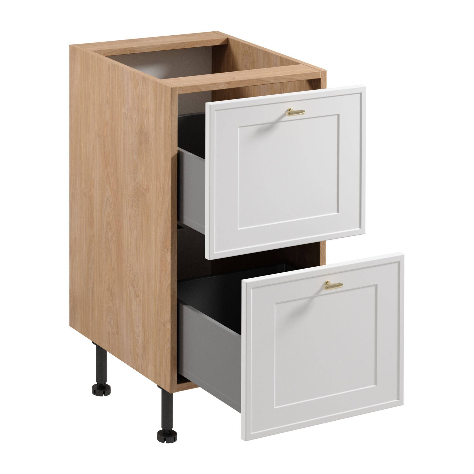 Imagine how perfect, elegant, and functional a kitchen cabinet could be, one you’d love to have in your kitchen. The Sorento 2S Base Cabinet from Gała Meble combines modern design with a classic matte finish. White MDF fronts perfectly complement the Puccini-colored body, creating a subtle yet striking contrast that adds a touch of elegance to the interior. Details like gold metal handles emphasize the luxurious character of this cabinet. The unique combination of colors and materials will attract the attention of anyone looking for more than just practical furniture. This cabinet offers more than just storage space; it’s also a statement of style that transforms your kitchen into a space brimming with character. The Sorento 2S Base Cabinet is designed with your everyday comfort in mind. Practical, fully extending drawers allow for easy access to stored items, while a soft-close mechanism ensures a peaceful, harmonious home environment. Thanks to the adjustable legs, the cabinet adapts perfectly to any surface, offering unparalleled stability and comfort of use.