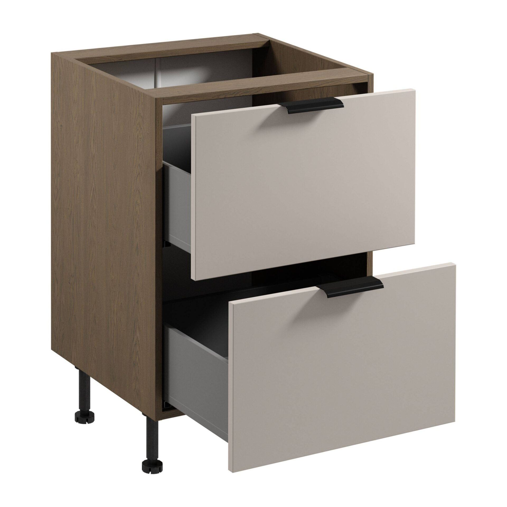 Discover the unique elegance and modern character that the Sorento 2S Lower Kitchen Cabinet will bring to your kitchen. Its matte beige front perfectly complements the body in the unique Baltic Storm shade, creating a harmonious color scheme that will enhance any interior. This cabinet is not only a fashionable accessory but also a practical solution for discerning users. When designing this cabinet, Gała Meble placed particular emphasis on high functionality without sacrificing aesthetics. Its modern design is highlighted by the black metal handle, which is not only decorative but also an ergonomic solution ensuring comfort in everyday use. The cabinet offers two spacious drawers that allow for efficient use of space while maintaining order in your kitchen. Thanks to the full extension slides, reaching every corner of the cabinet becomes incredibly easy. The drawers close gently and quietly, making this furniture an ideal choice for those who value comfort and convenience. The choice of materials, such as laminated board, guarantees not only aesthetic appearance, but also durability and resistance to damage, which is crucial in a kitchen environment.