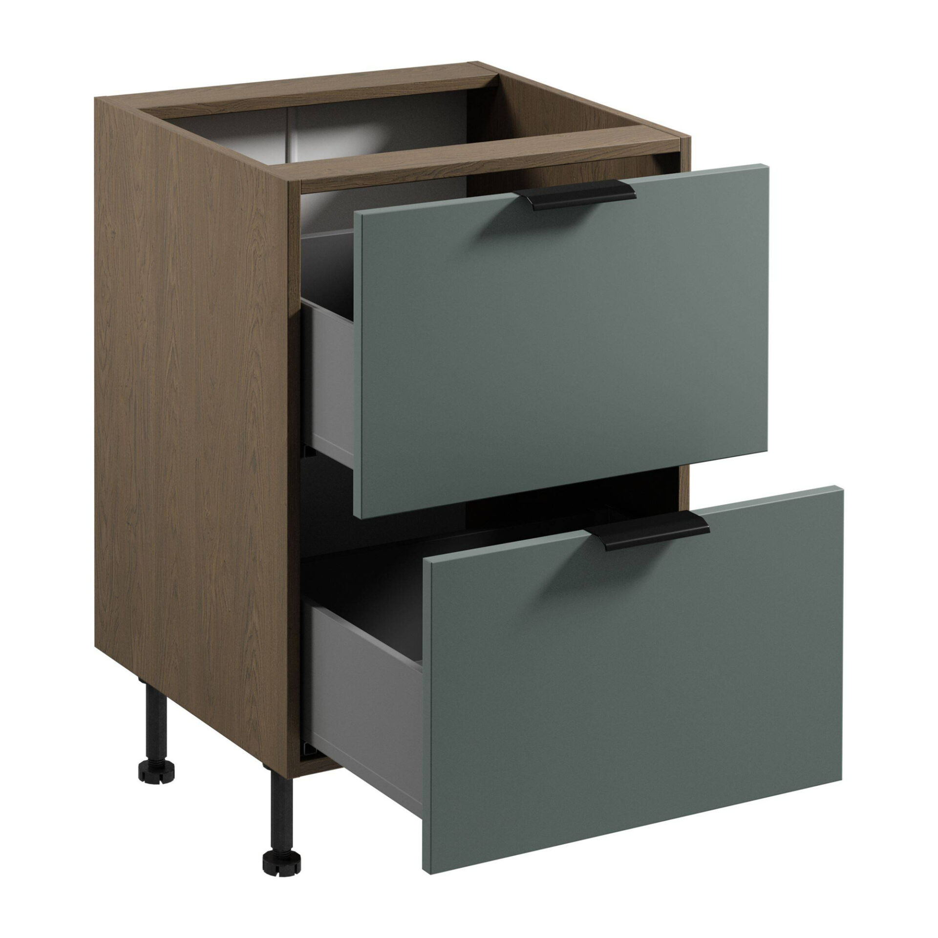 The Sorento D60S2 AX Baltic Storm Green Lower Kitchen Cabinet is a perfect blend of style and functionality, bringing a modern touch to any kitchen. With its elegant, matte green front, this piece becomes not only a practical piece of furniture but also a decorative element. The combination of Baltic Storm Green colors with black metal handles gives the cabinet a sophisticated, eye-catching character. This solidly constructed cabinet is not only pleasing to the eye but also comfortable to use. Thanks to its carefully selected dimensions and the use of highly durable laminated board, it is resistant to everyday damage. The height of the adjustable legs adds stability, and the ability to personalize the height allows the cabinet to fit a variety of surfaces, a significant advantage in modern kitchen designs. Spacious and functional drawers are key to maintaining order while preparing meals. Full extension and soft-close mechanisms allow for convenient access to the entire drawer space, significantly simplifying the organization and storage of essential kitchen accessories. It’s the perfect solution for those who value thoughtful details and ease of use in the kitchen.