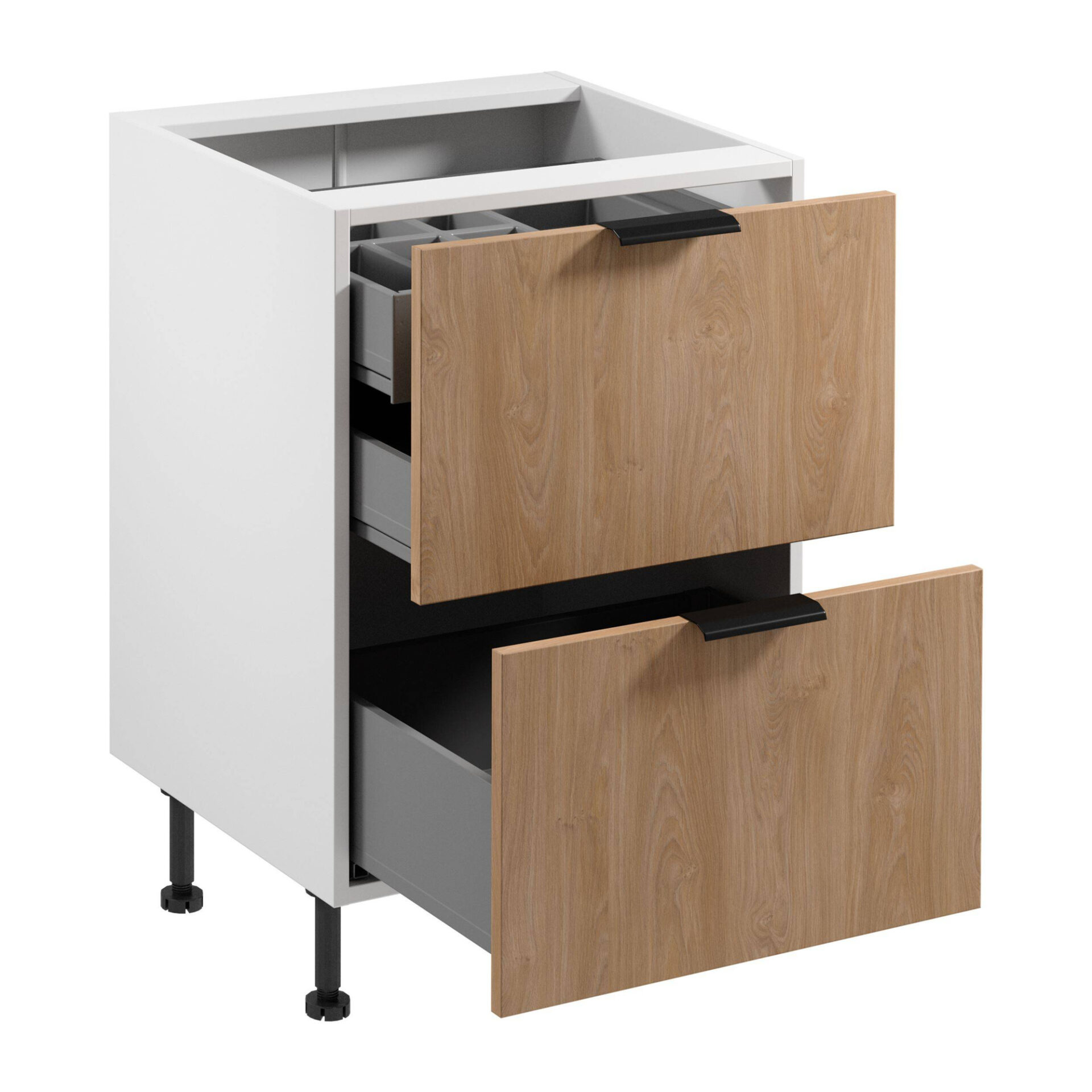 Introducing the Sorento 2S base kitchen cabinet with cutlery insert, which will bring a touch of modernity and elegance to your kitchen. The sophisticated combination of Puccini color and matte white body makes the cabinet not only a functional piece of equipment but also a decorative element. Its classic yet sophisticated design will fit perfectly into a variety of kitchen arrangements. Thanks to its construction, the cabinet offers exceptional practicality and comfort of use. You can easily store all your essential kitchen accessories, while the cutlery insert ensures order and easy access to frequently used items. Black metal handles add a modern touch, and full-extension drawers provide easy access to all their contents. High, adjustable feet guarantee stability, and the ability to adjust them to your needs is an additional advantage. This allows the cabinet to perfectly match the height of your kitchen countertop, ensuring a cohesive look throughout the entire unit. Self-assembly is simple and intuitive, allowing for quick and hassle-free installation in your kitchen.