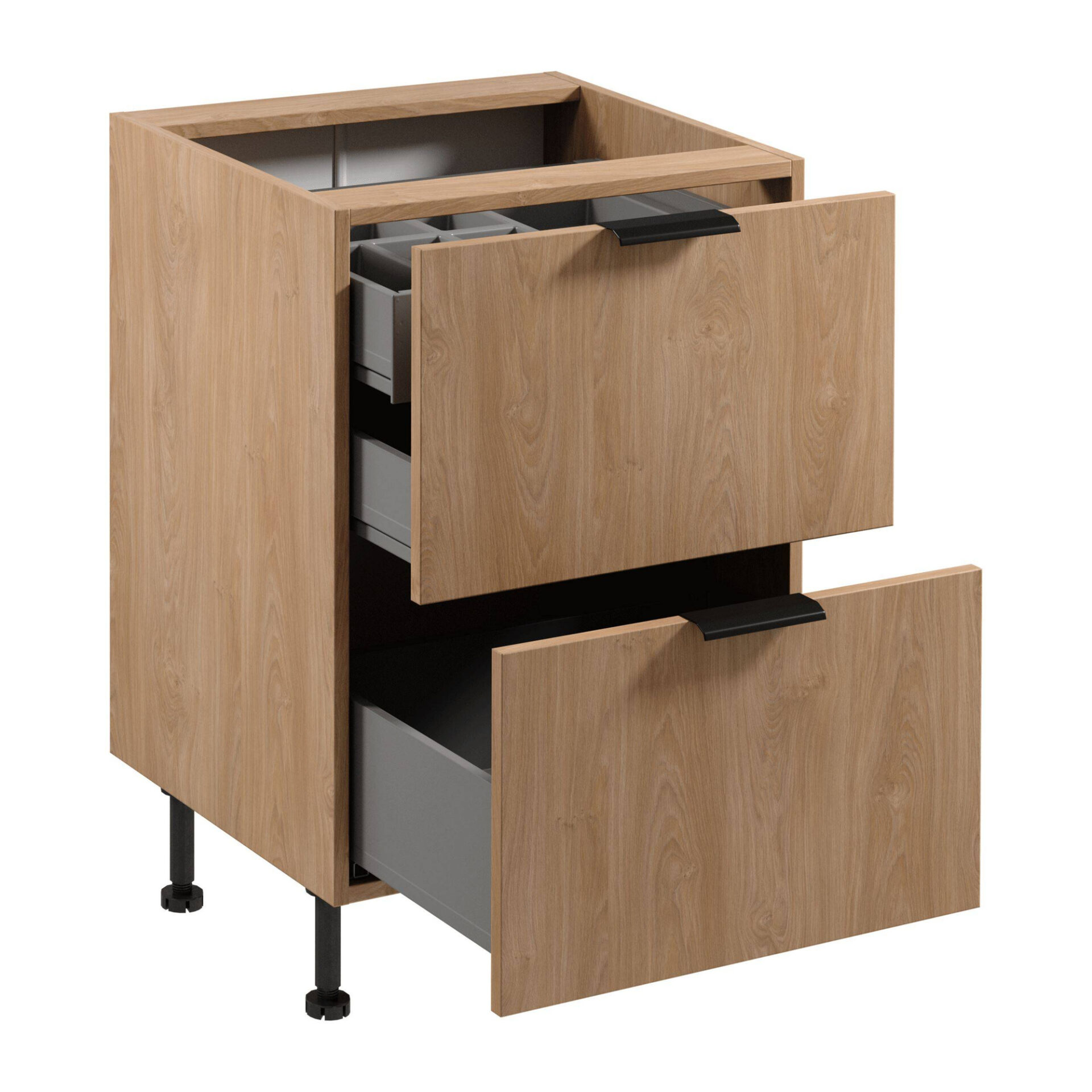 Practicality and elegance meet in the Lower Kitchen Cabinet from the Sorento D60S2+1 AX Puccini collection by Gała Meble. This unique cabinet is perfect for those who want to add a touch of modernity and classic style to their kitchen. Made of durable laminated board, it offers sophistication and durability in an elegant Puccini shade that adds a refined character to the interior. It’s not just its aesthetics that make this cabinet stand out from the crowd. Its well-thought-out design with black metal handles makes it not only beautiful but also practical. Adjustable legs allow for height adjustment to individual needs, making it a versatile choice for any kitchen. The solid structure ensures stability, and full-extension slides guarantee easy access to the contents. The cabinet’s interior is surprisingly functional. Equipped with one inner drawer with a cutlery insert and two practical outer drawers, it allows for efficient space management. A maximum drawer load of up to 40 kg means it is strong enough to handle all your kitchen needs.