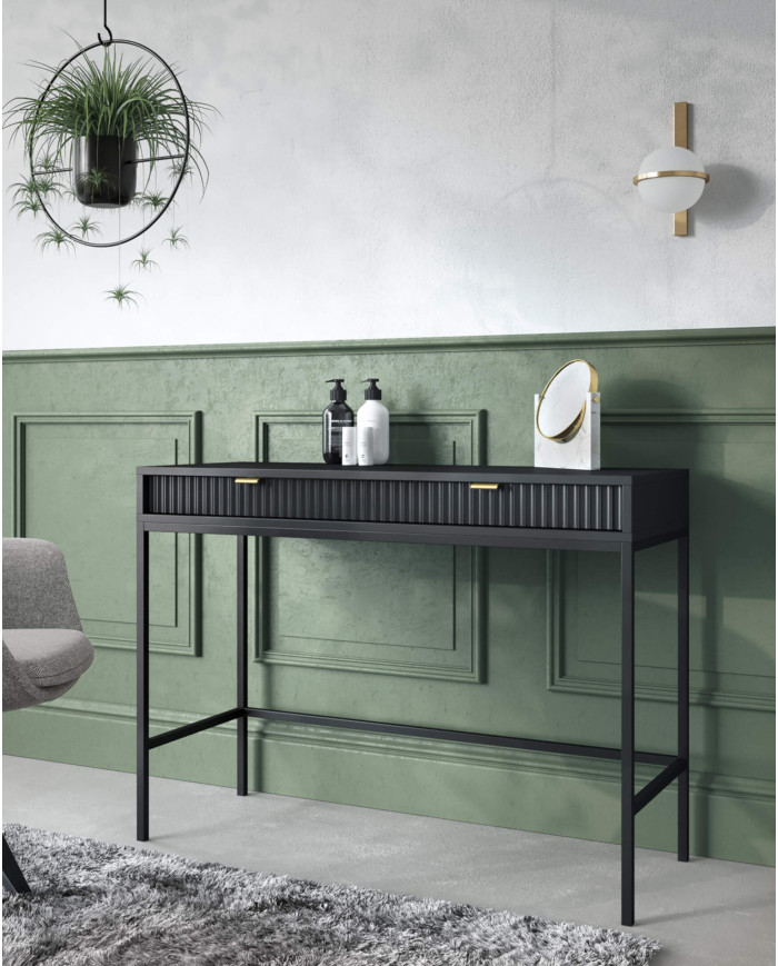 The modern and unique Nova S54 bedside table features a spacious drawer and a practical recess. The body is made of black furniture board, and the front is made of grooved black MDF, adorned with an elegant gold handle. The entire unit rests on high (20cm) gold feet connected to a solid and stable base. The bedside table is constructed of laminated furniture board, which is highly scratch-resistant and easy to clean. The unit is delivered flat-packed with clear assembly instructions. A gold frame and legs option is also available.