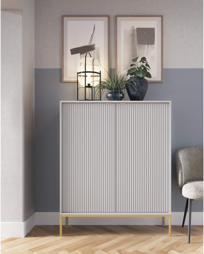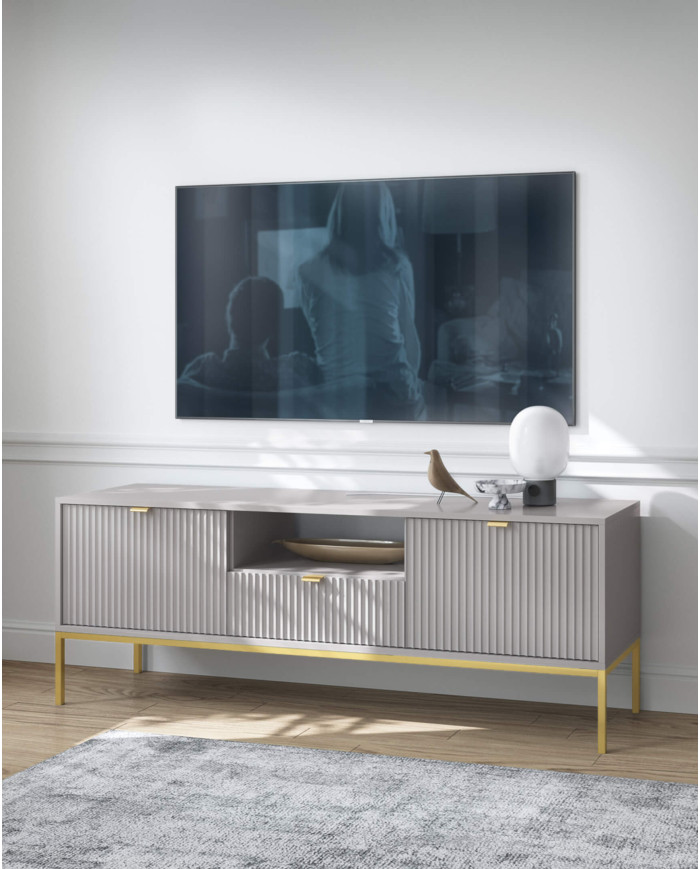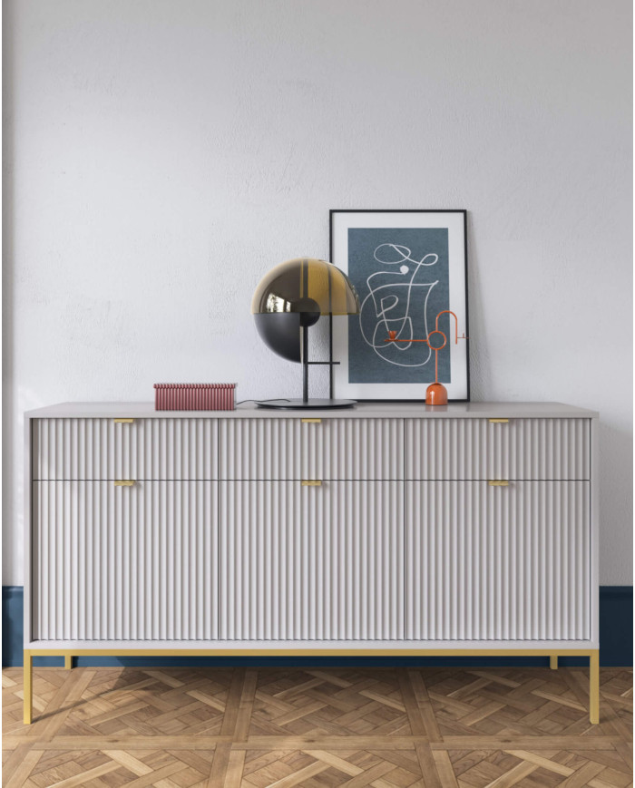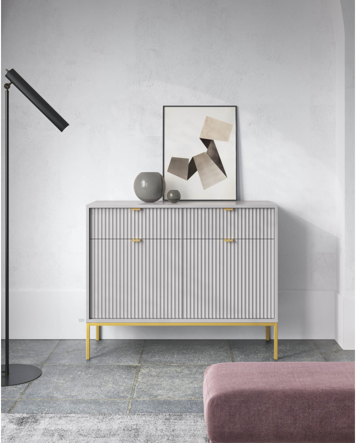 The modern and fashionable Nova S54 nightstand features a spacious drawer and a convenient recess. The body of the set is made of gray furniture board, and the front is made of grooved gray MDF, adorned with an elegant gold handle. The entire unit rests on tall (20cm) gold legs connected to a solid and stable base. The nightstand is constructed of laminated furniture board, which is highly scratch-resistant and easy to clean. The unit is delivered flat-packed with clear assembly instructions. A black frame and feet option is available.