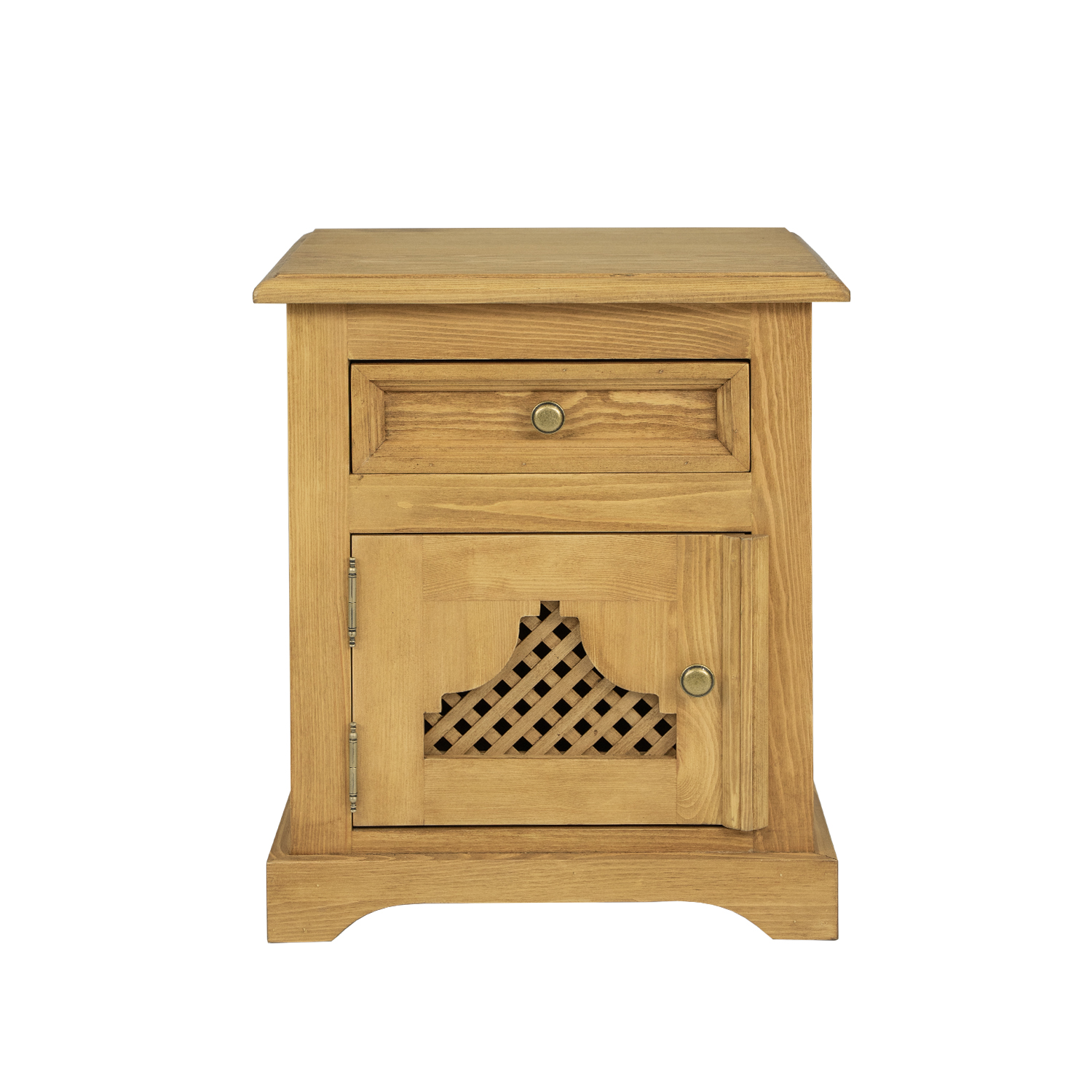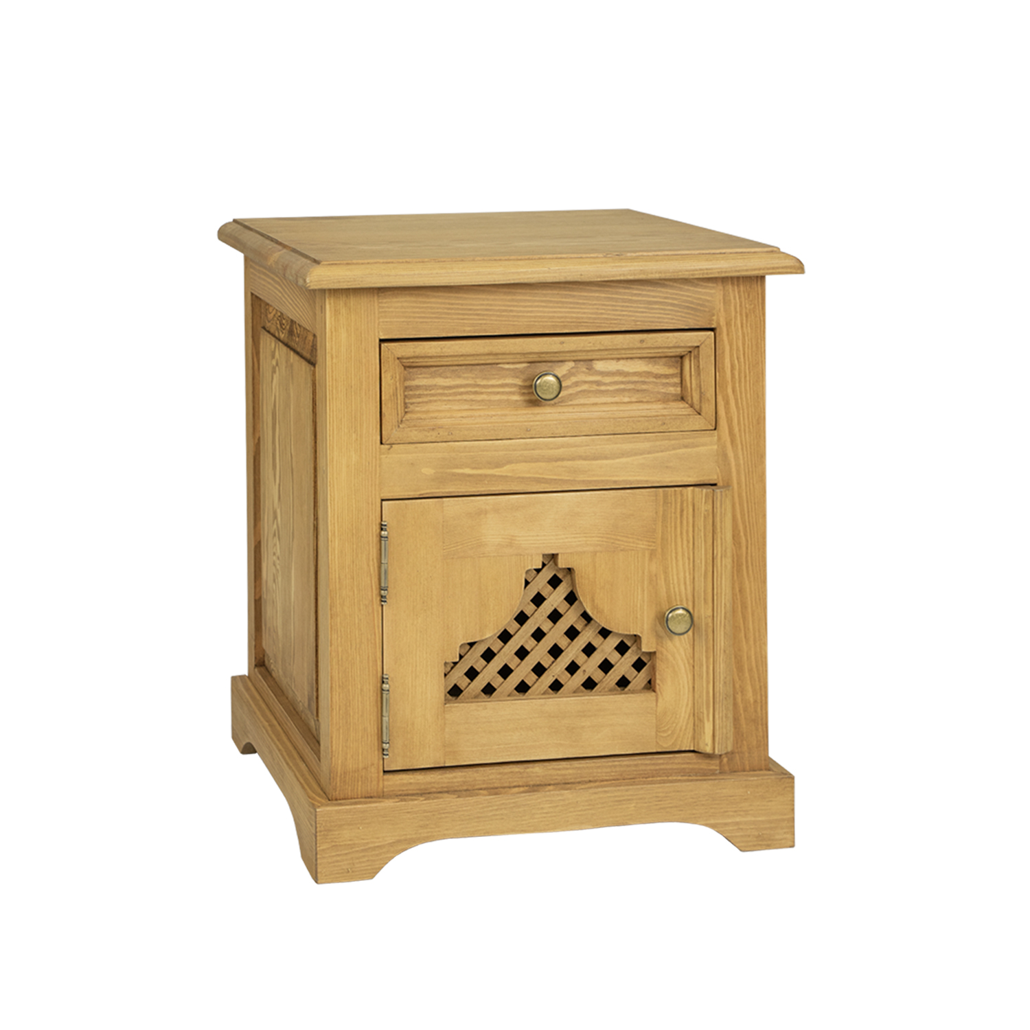 The waxed SN804 nightstand in the STANDARD version is designed in a rustic style and crafted entirely from solid pine. This sturdy pine nightstand features an openwork, decorated door front and one handy drawer that slides out on wooden runners. The sturdy sides are adorned with carved paneling. Metal handles and hinges in an antique gold finish are used for its construction. This nightstand is a practical solution for any bedroom. The small but practical top can be used to place a nightstand lamp or to store small items you want to have within reach after waking. The SN804 nightstand will add a unique atmosphere to any interior, full of warmth and a family atmosphere. Its functionality will make storage much easier. SLIM Nightstand SN704 LEFT