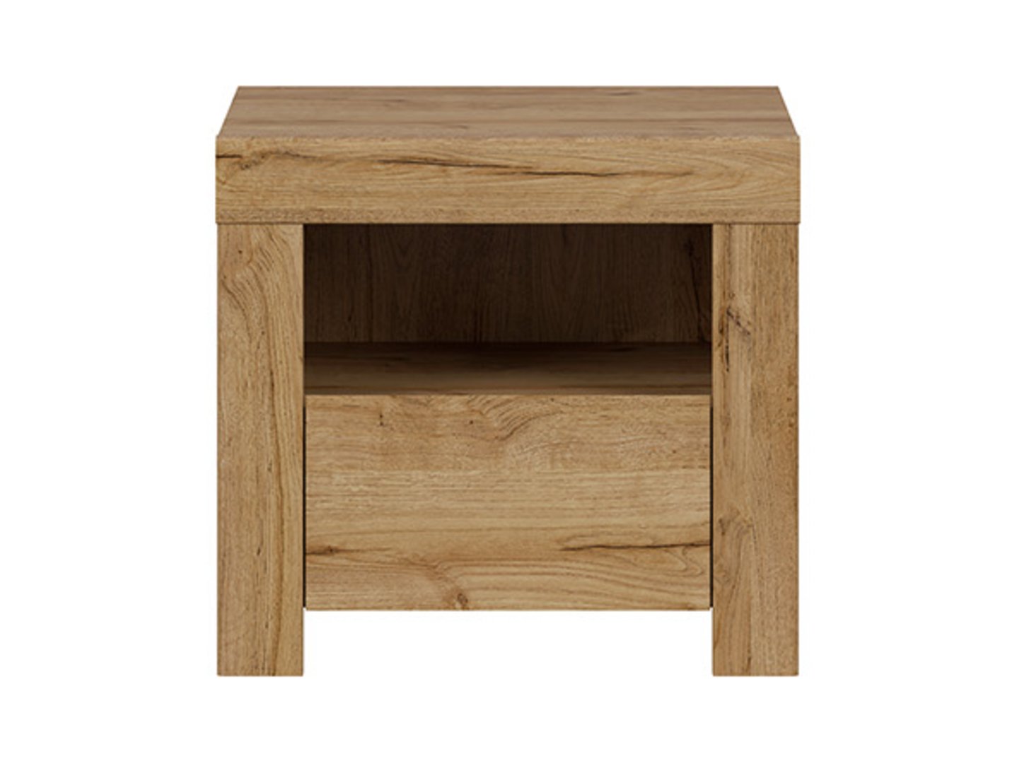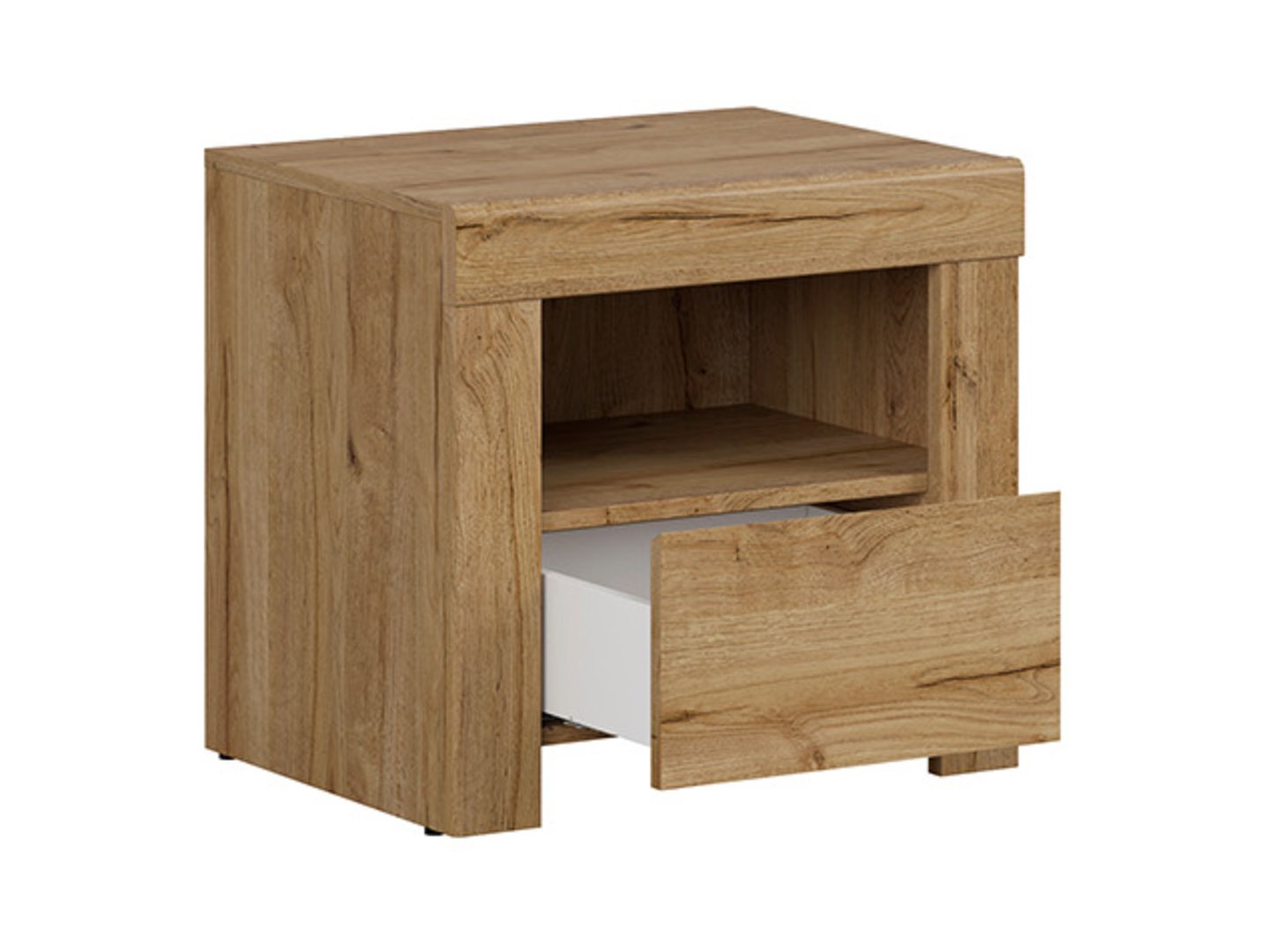 Holten Nightstand – Your Practical Bedroom Companion. If you’re designing your bedroom, you can’t forget about practical furniture that will make your everyday life easier. The Holten Nightstand, part of the modern Holten collection, is the perfect addition to your bedroom, adding elegance while also providing storage for essentials. Functional Design: The Holten Nightstand is designed with everyday use in mind. Its top has space for a glass of water, an alarm clock, and a night lamp, allowing for comfortable and functional mornings and evenings. Additionally, the open shelf is the perfect place for your phone, which is always within reach, while the compact drawer allows you to store chargers and other small items, keeping your bedroom tidy. The Holten Nightstand features a Waterford Oak finish with a distinctive grain. This natural wood appearance gives the piece character and makes it an important element of your bedroom design. The thickened slats of the body provide a perfect frame for the smooth front surface, adding elegance to the piece. The Holten bedside table is available in two color options: white/wotan oak/gloss white and waterford oak. This allows you to match the piece to your personal taste and bedroom design style. Consistency in form and structure is crucial in the bedroom. The Holten bedside table is a perfect solution that complements other elements of the Holten collection. This allows you to create a harmonious relaxation space where all the pieces work together perfectly. In short, the Holten bedside table is not only a practical piece of bedroom furniture but also a decorative element that enhances the character of the interior. Its functionality and elegance will make it an indispensable element of your daily routine. Relax surrounded by beautiful and practical furniture with the Holten bedside table.
