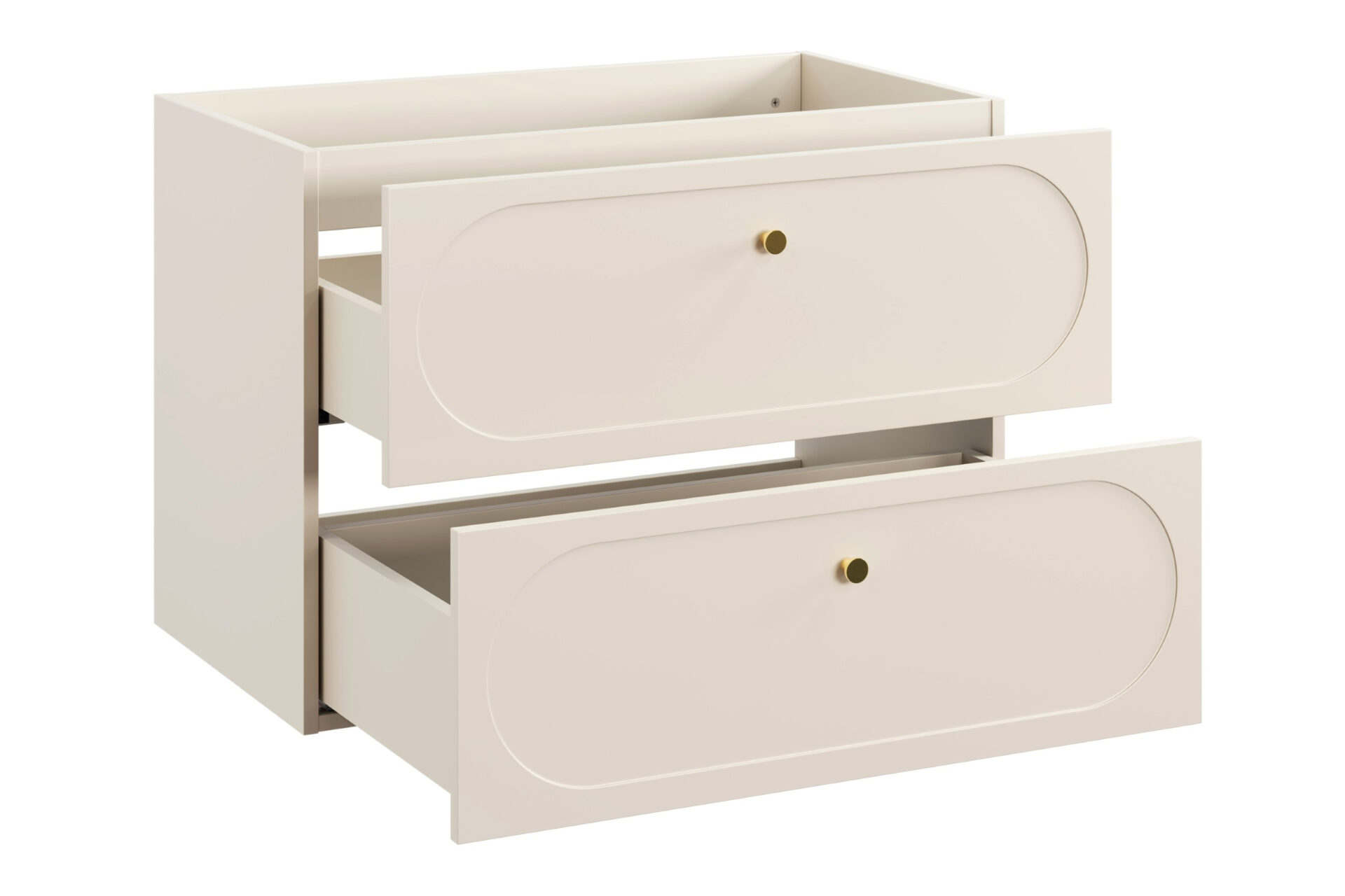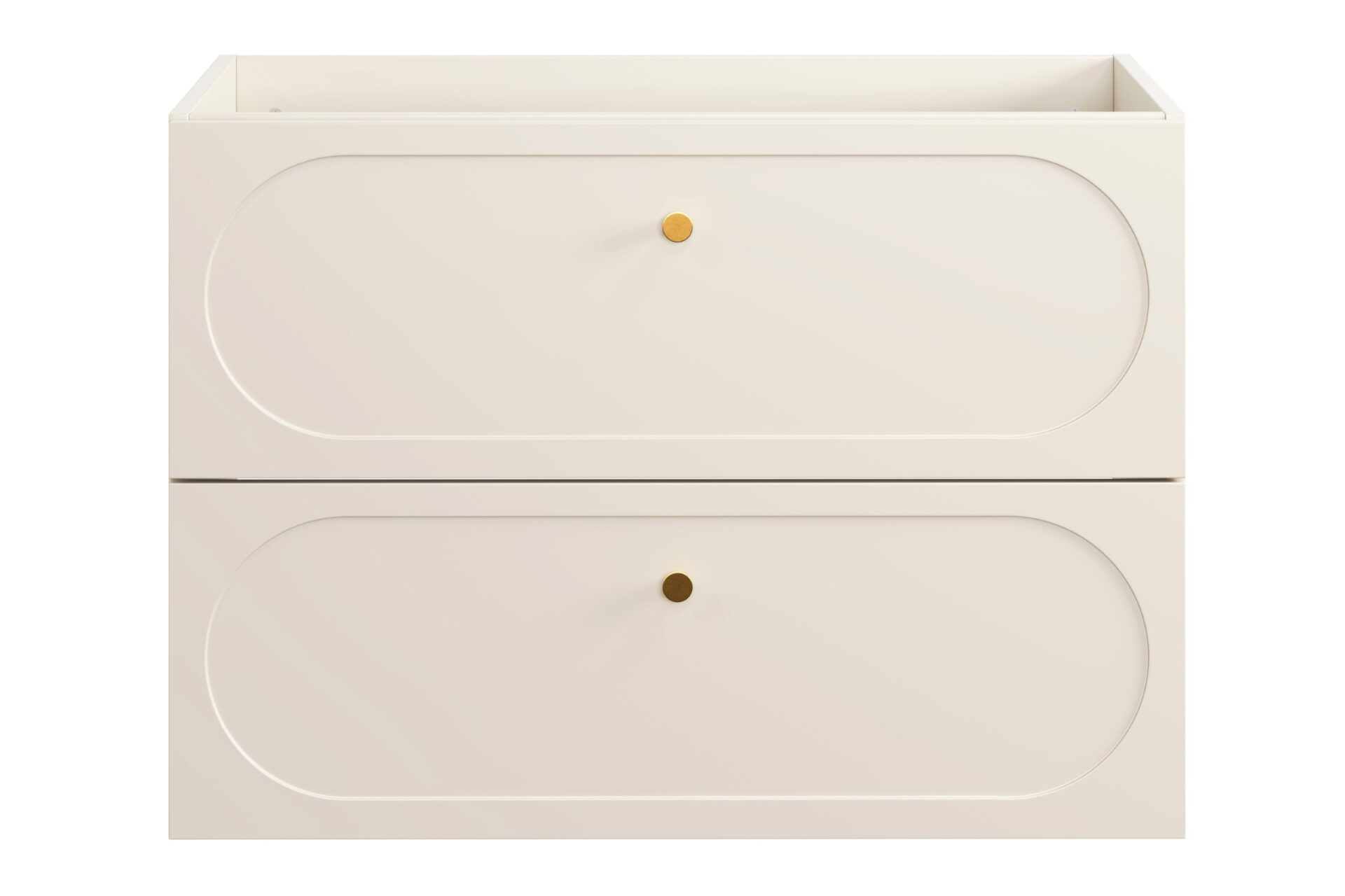 Donna Sand 80 cm 2-Drawer Sink CabinetThe Donna Sand 80 cm sink cabinet is a blend of modernity and classic style. Delicate Sand Beige fronts and gold metal knobs add elegance. Two soft-closing drawers provide convenient storage for accessories. Dimensions: Width (cm): 80 Depth (cm): 46 Height (cm): 57 Weight (kg): 23.9 Technical Data: Body Color: Sand Beige Front Color: Sand Beige Handle Color: Glossy Gold Body Material: Laminated Board Front Material: MDF Board Handle Material: Metal Runners: Soft-closing Mounting Kit Included: Yes Assembly: Self-assembly The 80 cm washbasin cabinet with two drawers from the Donna Sand collection is the perfect solution for modern bathrooms that want to harmoniously combine functionality with elegance. Its sophisticated design in a shade of Sand Beige enriched with subtle milling adds lightness and at the same time introduces warmth and originality to the interior. This is the perfect piece to make your bathroom not only practical but also stylish. Made of high-quality materials such as laminated board and MDF, this cabinet ensures durability and longevity. Gold metal knobs complete the design, emphasizing the elegance and modern character of the furniture. The soft-close drawer system ensures comfort during everyday use, eliminating unpleasant noises. This allows everyone to enjoy a peaceful bath at home. The cabinet offers storage space in the form of two spacious drawers, perfect for organizing bathroom accessories. By keeping your bathroom tidy, you’ll make daily care even more enjoyable. By personalizing the space with recommended products, you can create a unique interior tailored to your needs. Every detail of the Donna Sand collection has been carefully considered to ensure the highest level of aesthetics. Polish production using materials certified in accordance with FSC standards emphasizes high quality and environmental friendliness. The furniture is delivered in self-assembly packages, meaning everyone can enjoy it without the need for professional help. By choosing an 80 cm vanity unit from the Donna Sand collection, you gain not only an aesthetically pleasing addition to your bathroom, but also a piece of furniture with exceptional practical benefits. It’s a perfect combination of style, functionality, and quality that will surely meet the expectations of even the most demanding users.