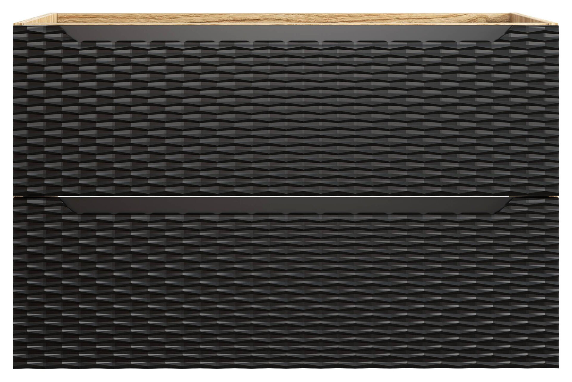 Washbasin Cabinet 90 cm OCEAN BLACKThe OCEAN BLACK washbasin cabinet by Comad combines modern design with functionality. Matte black MDF front with a milled pattern and an oiled oak body create an elegant contrast. Two drawers with a soft closing mechanism and easy wall mounting. Dimensions: Width (cm): 90 Depth (cm): 46 Height (cm): 57 Weight (kg): 32.5 Technical data: Color: Matte Black, Oiled Oak Material: Laminated Board / MDF Board Body Material: Laminated Board Body Color: Oiled Oak Fronts Material: MDF Board Fronts Color: Matte Black Fronts Structure: Milled Pattern Assembly required: Yes Mounting dowels included: Yes Mounting kit included: Yes Indoor installation method: For hanging on the wall Drawers Quantity: 2 Drawers Drawer 1 Construction: Solid bottom with a cutout in the back Strips – Recommended Installation of a Low Wall Siphon – Siphon Not Included Drawer 1 Extension: 3/4 Extension Drawer 2 Extension: Full Extension Top Drawer Organizer: No Drawer 1 Load Capacity: 5 Number of Doors: Universal Hinges: Soft-close Handles: Integrated Handle Material: MDF Board Handle Color: Matte Black Fixed Shelf Material: Not applicable Fixed Shelf Color: Not applicable Fixed Shelf Load Capacity (kg): 0 Adjustable Shelf Material: Not applicable Adjustable Shelf Color: Not applicable Adjustable Shelf Load Capacity (kg): 0 The OCEAN BLACK washbasin cabinet by Comad is a true work of art among bathroom furniture. Its modern design fits perfectly into the latest interior trends, ensuring elegance and sophistication in any room. A matte black front combined with oiled oak creates a unique composition that will delight even the most demanding users. It’s not just its appearance that makes OCEAN BLACK exceptional. It’s also an exceptionally functional piece of bathroom equipment. Thanks to its well-thought-out design and solid construction of laminated board and MDF, the cabinet is durable and resistant to everyday use. Two spacious drawers provide space for all your essential accessories, allowing you to keep everything organized and always at hand. The wall-mounted OCEAN BLACK cabinet not only saves space in your bathroom but also gives it a modern look. Minimalist, integrated handles in matte black emphasize its stylish character while also being comfortable to use. Assembly is simple and intuitive, as all the necessary mounting hardware is included. OCEAN BLACK is synonymous with elegance and practicality. The milled structure of the fronts adds a subtle dynamic to the overall design, breaking the decorating routine of any bathroom. By choosing this cabinet, you gain not only a beautiful decoration but also a functional element that will facilitate daily beauty rituals. See for yourself what a huge difference one stylish piece of furniture can make.