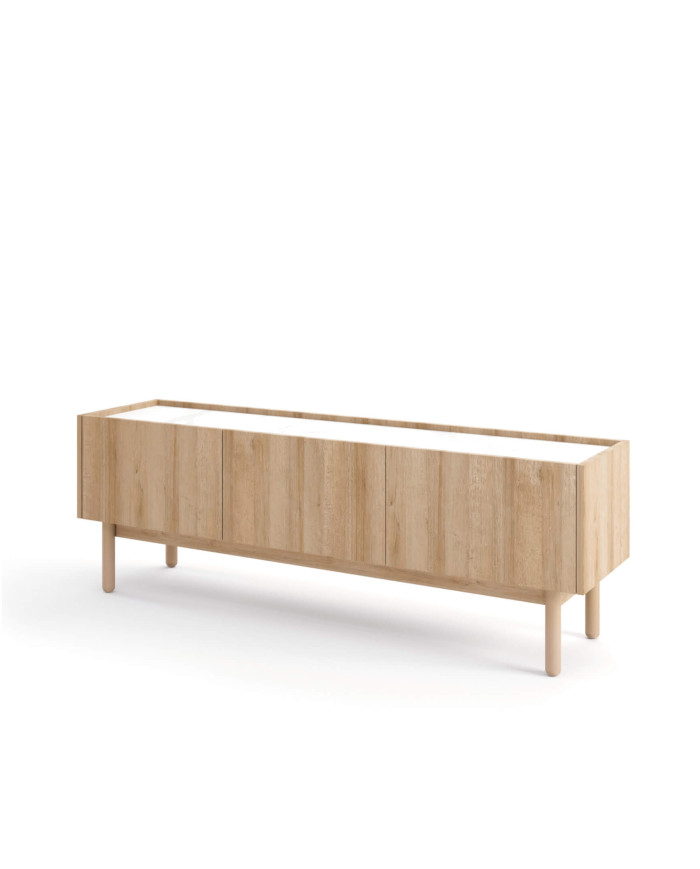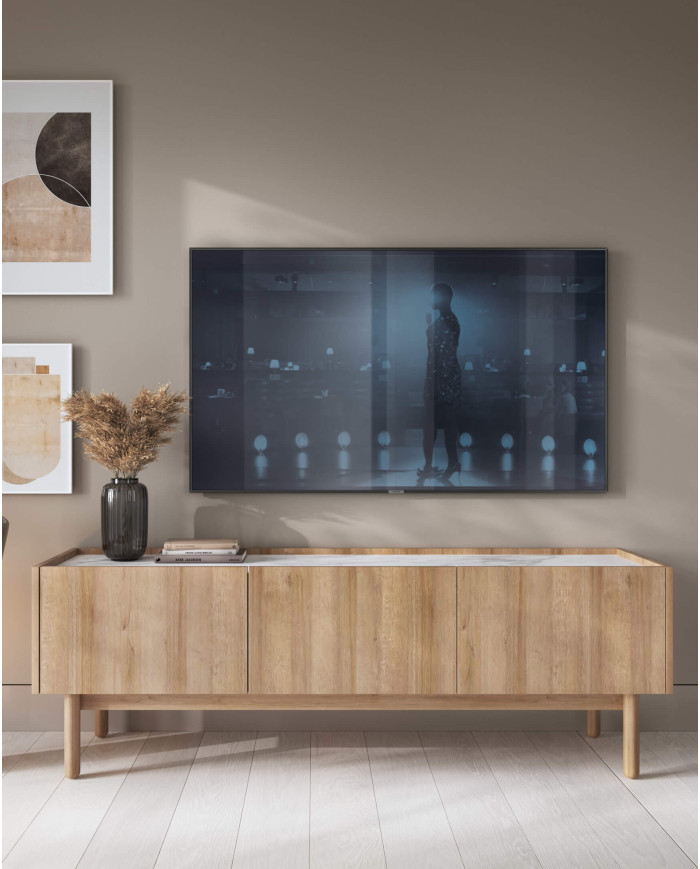 The modern and functional Boho RTV144 TV stand is made of scratch-resistant laminated board with an image of Riviera Oak. Its top features a bianco marble design and is distinctively lowered compared to the sides and fronts of the cabinet. The unit features three hinged doors and rests on high (20 cm) wooden legs. The TV stand requires assembly and is supplied with clear instructions.