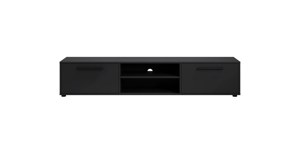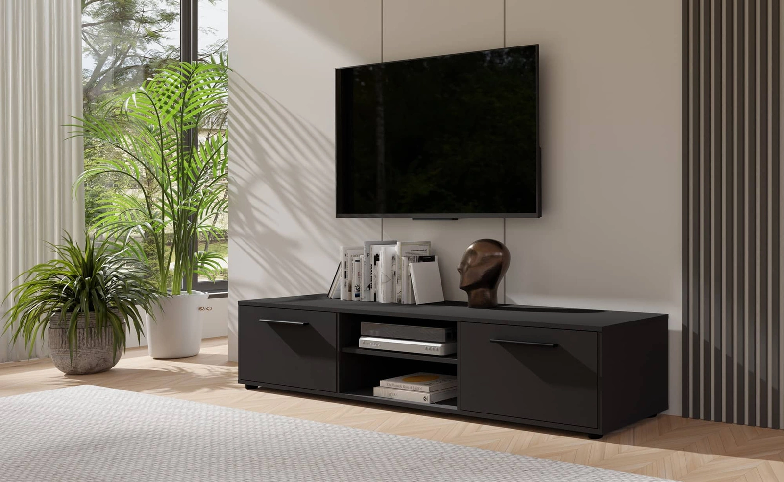 The TV stand features two downward-opening doors and a shelf. The recess in the center of the stand is perfect for TV equipment or a game console. The TV stand guarantees comfortable and trouble-free use and ensures the durability of the entire piece for many years of use. The classic black finish adds elegance and character to the room, making Maxione TV stands perfect for spacious, bright interiors in a modern style. Modern TV stands and industrial TV stands with an elegant finish will perfectly complement any décor.