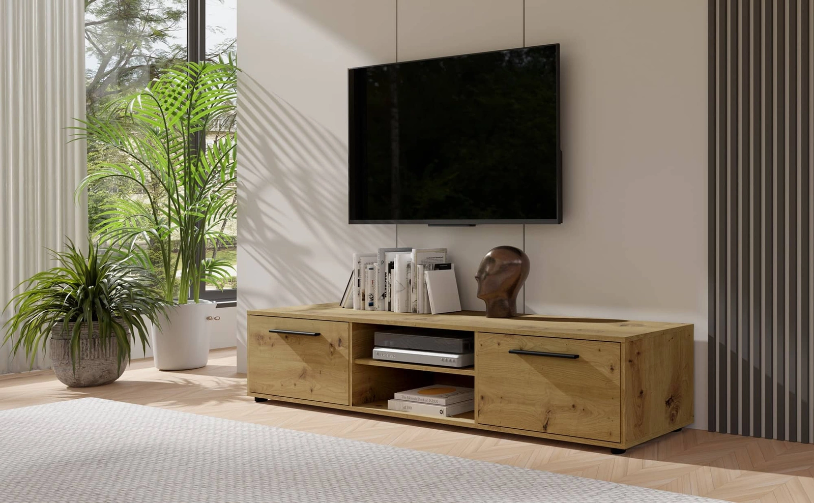 The TV stand features two downward-opening doors and a shelf. The recess in the center of the stand is perfect for TV equipment or a game console. The TV stand guarantees comfortable and trouble-free use and durability for many years of use. The warm oak shade will give the room a light and cozy atmosphere, making Maxione TV stands perfect for spacious, bright interiors in a modern style. Modern TV stands and industrial TV stands with an elegant finish will perfectly complement any décor.