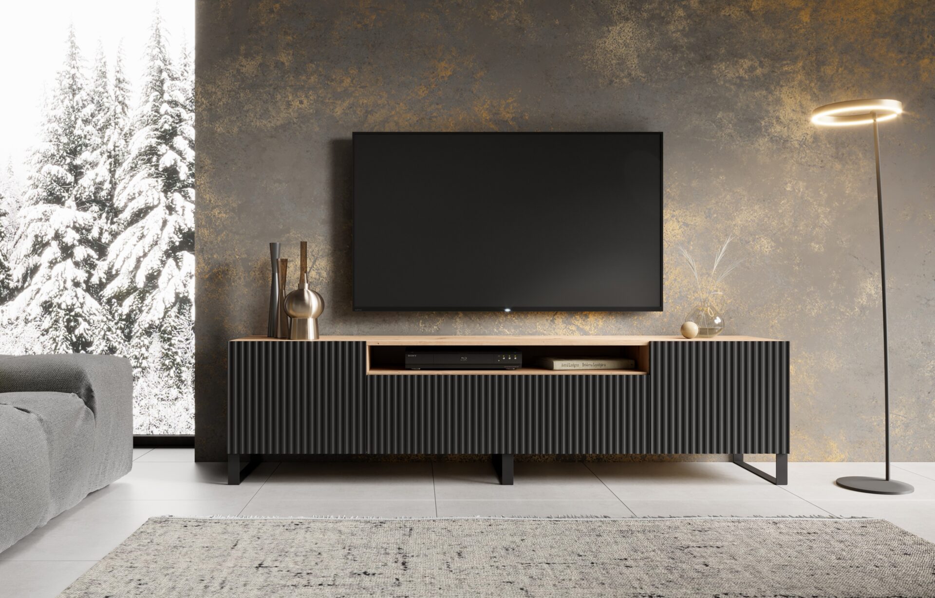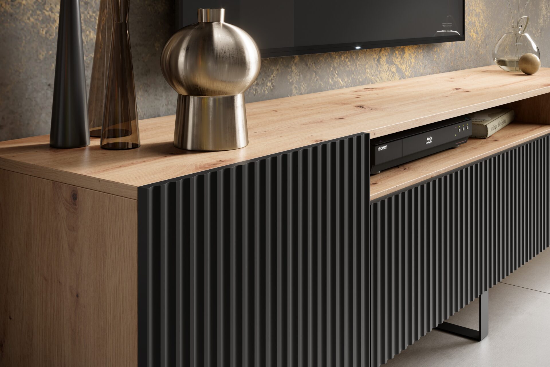 The Noemi TV stand is a modern, elegant, and functional TV stand, perfect for modern interiors. Its unique feature is a grooved finish that adds character and texture to the piece. The stand is designed to include adequate compartments and shelves to accommodate a variety of electronic equipment, including a television, set-top box, game console, and more.