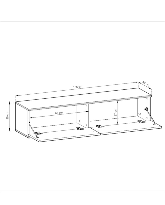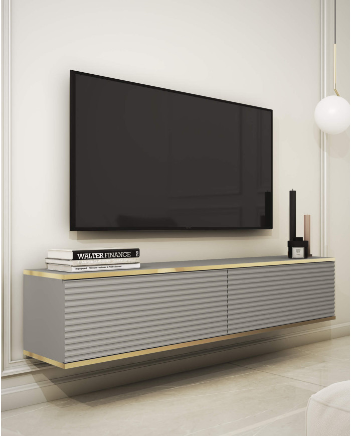 The functional Oro 135 MDF wall-mounted TV cabinet in Gray/Gold features two hinged doors with flaps. The cabinet is made of scratch-resistant laminated board, which offers increased scratch resistance. The fronts are made of durable MDF with a horizontal grooved finish. The cabinet is delivered flat-packed with easy-to-follow assembly instructions. Other color options are also available: white/gold, beige/gold, and black/gold.