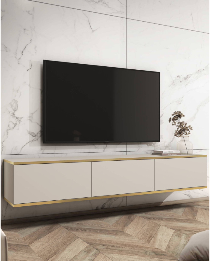 The large and modern Oro 175 TV stand in beige/gold was designed for wall mounting, giving it a uniquely light and attractive appearance. Its design allows for cleaning under the unit using cleaning robots. The set features three niches with hinged flaps. The unit is made of scratch-resistant laminated board, which is characterized by increased scratch resistance. The stand is delivered ready for self-assembly, with clear instructions.