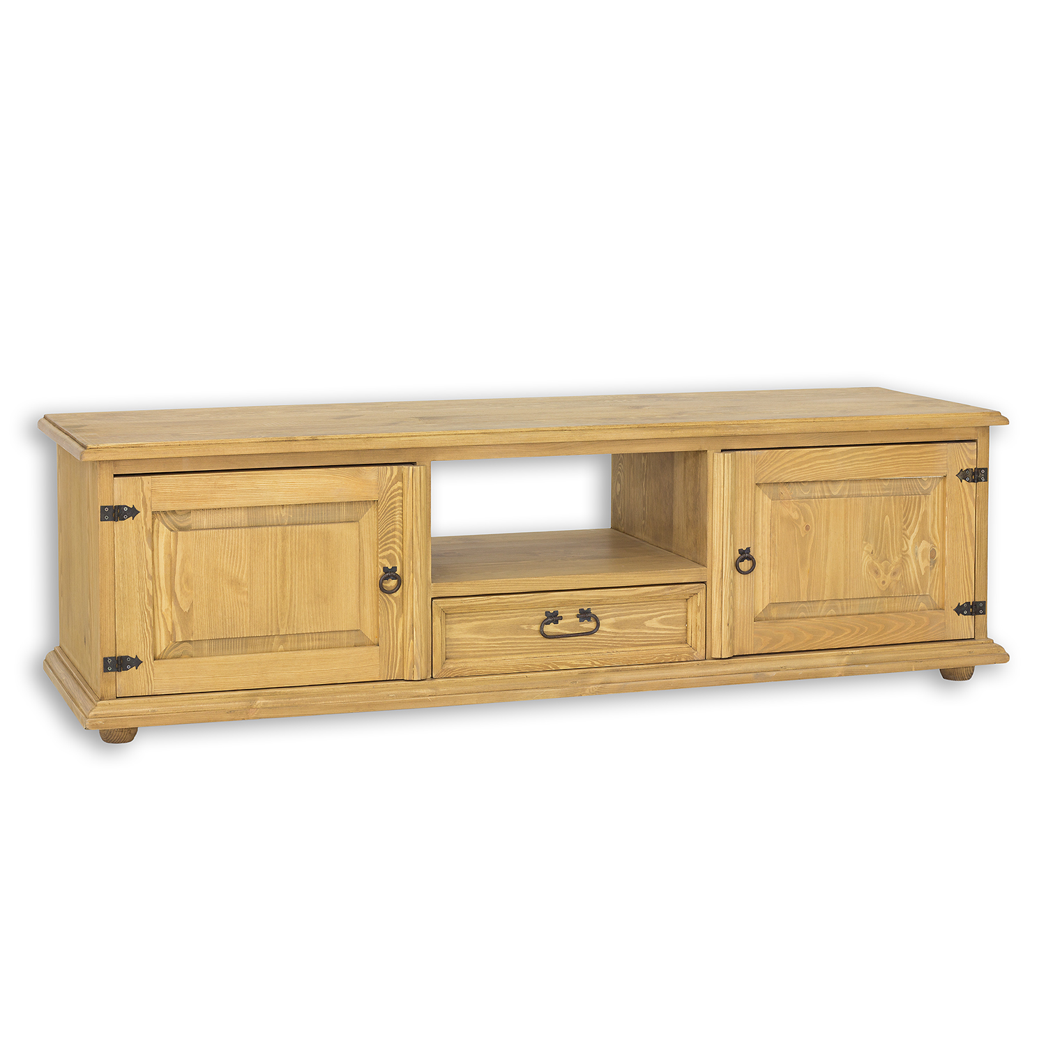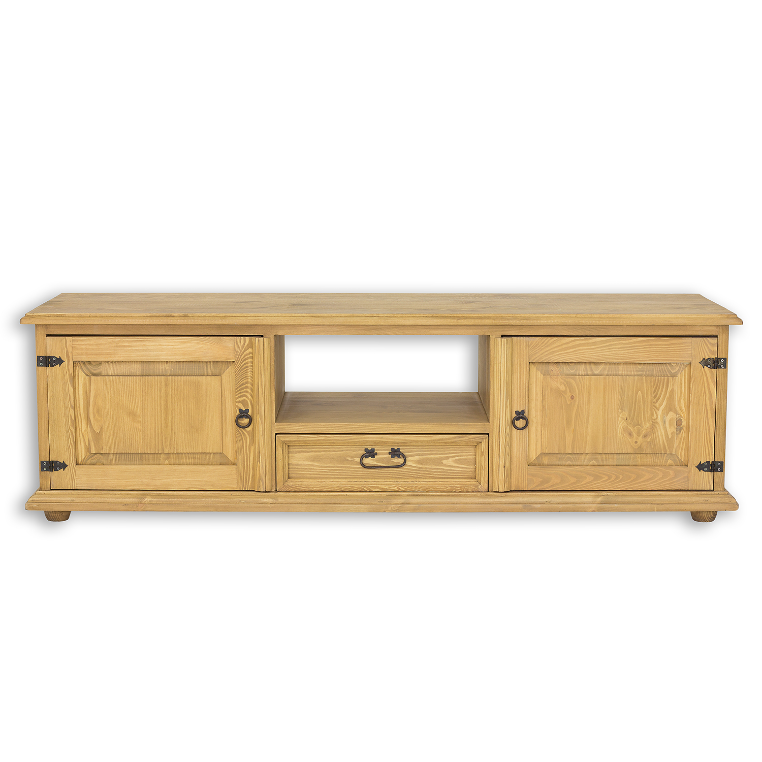 The waxed RV704 TV stand, designed in a rustic style, is crafted entirely from solid pine wood. It sits on wooden ball-shaped legs and features two open shelves separated by a pull-out drawer on wooden slides. Above the drawer is an open space that can be used to store a set-top box. The door fronts and bottom of the stand are decorated with milled details. The unit boasts a durable and robust construction. Handmade metal hinges and handles with an aged effect were used in its construction. The RV704 stand will add a unique atmosphere to any interior, full of warmth and a homely atmosphere.