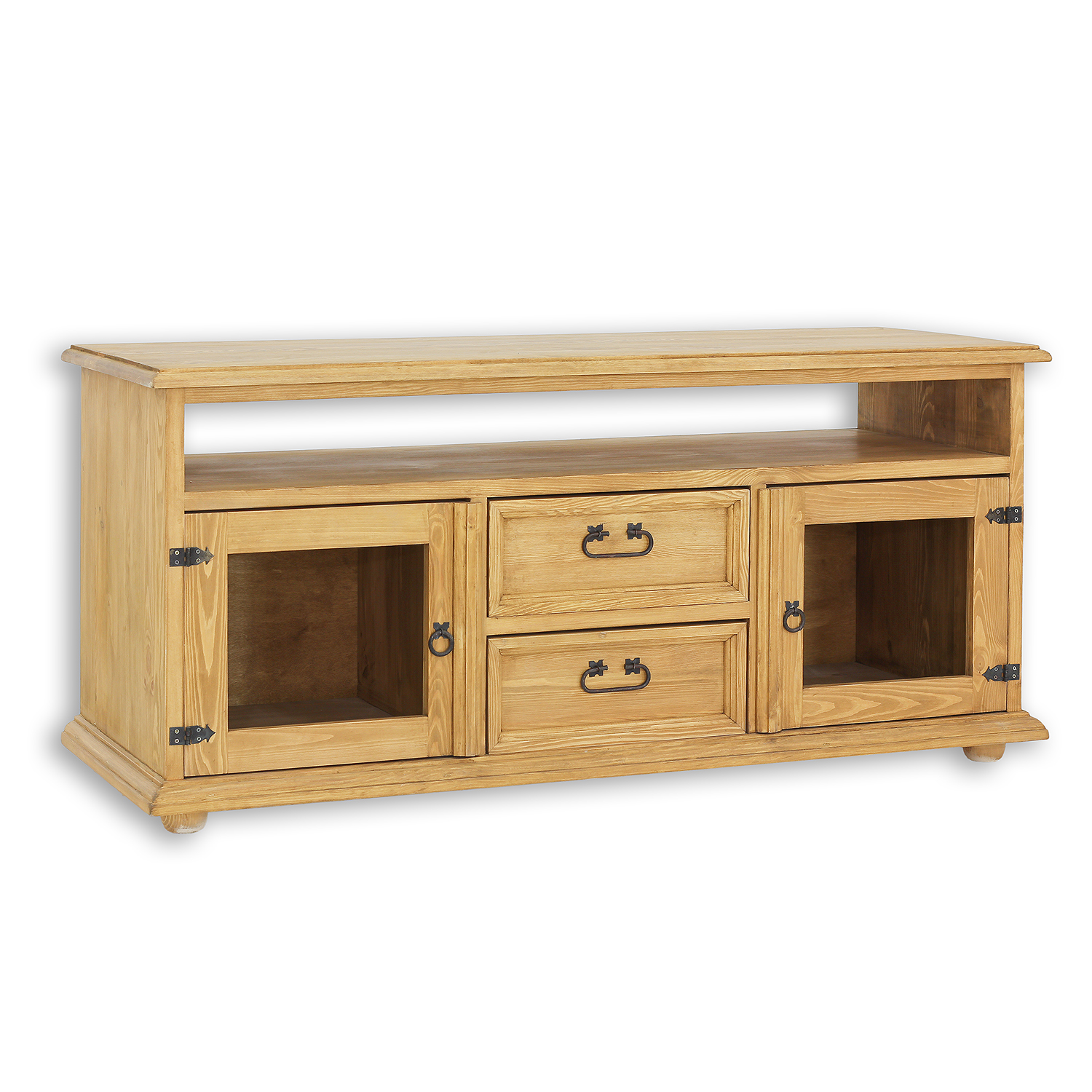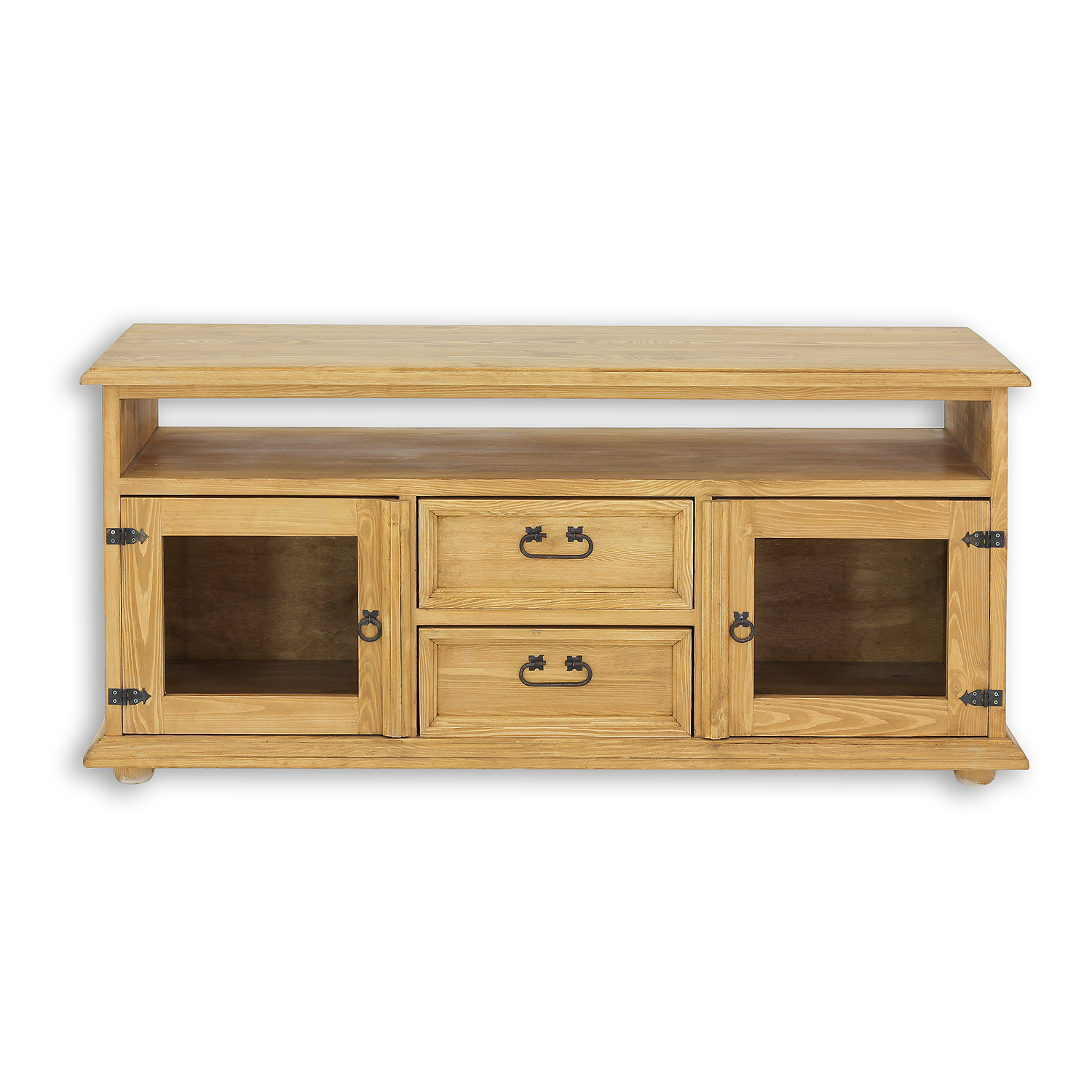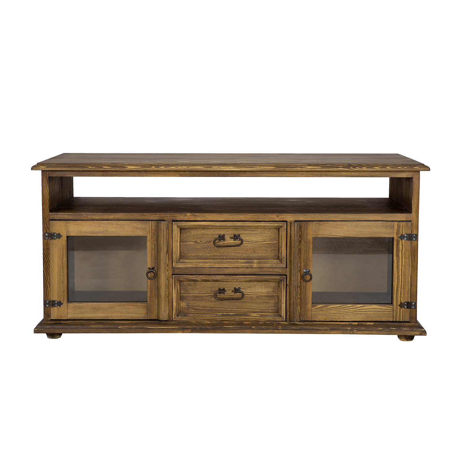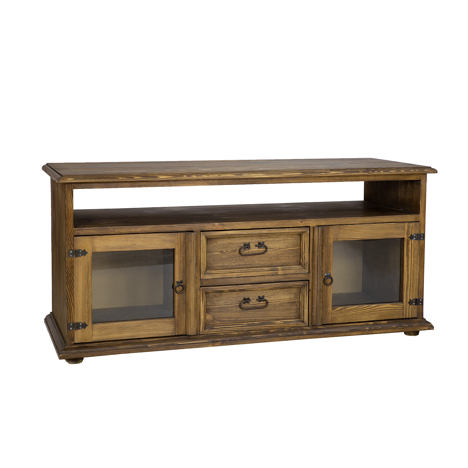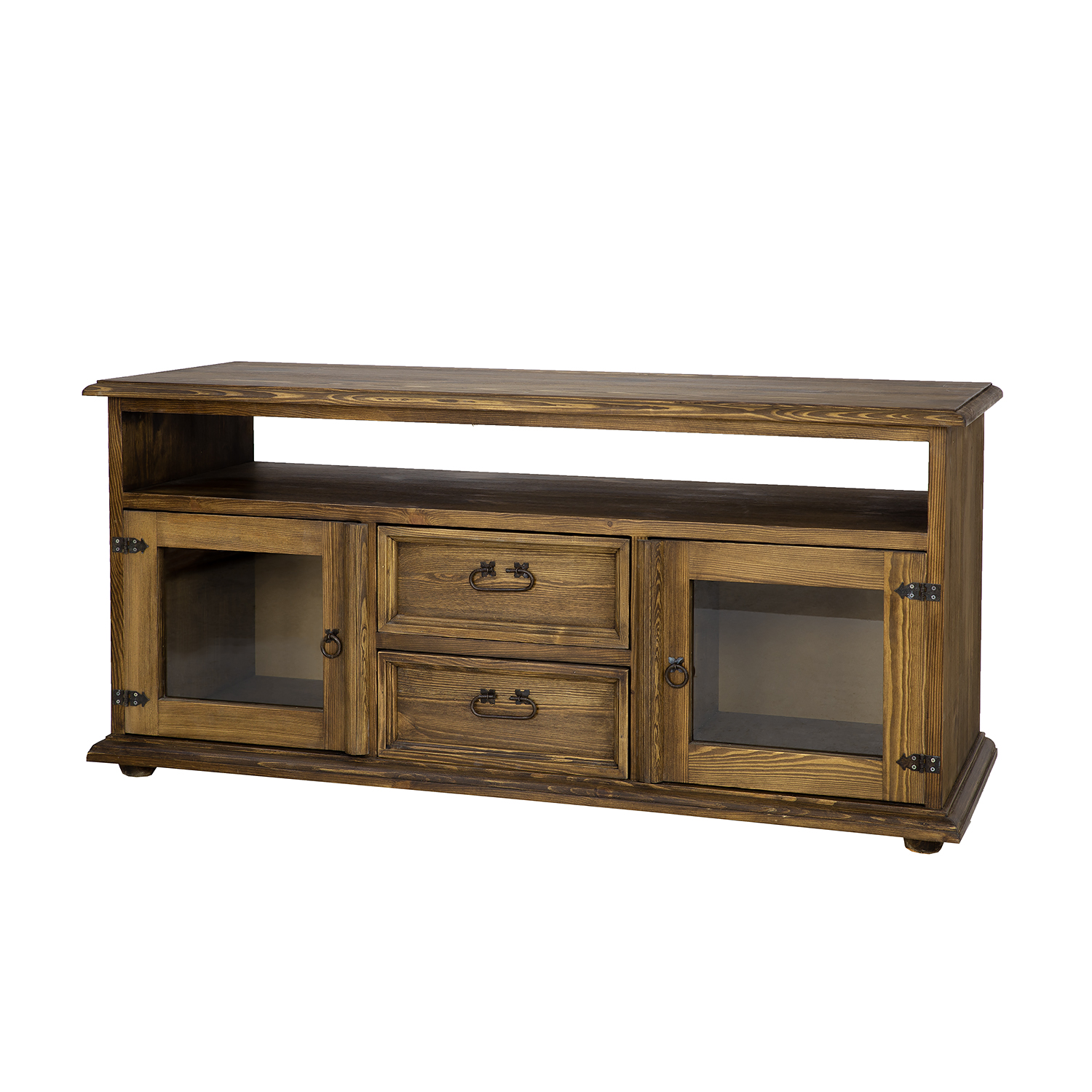 The waxed RV706 TV stand, designed in a rustic style, is crafted entirely from solid pine wood. It sits on wooden ball-shaped legs. The wooden unit consists of three sections – two side shelves with single glass doors separate drawers on wooden runners. Additionally, a practical recess for TV equipment is located directly under the tabletop. The unit boasts a durable and solid construction. Handcrafted metal hinges and handles with an aged finish were used in its construction. The RV706 unit will add a unique atmosphere to any interior, full of warmth and a homely atmosphere.