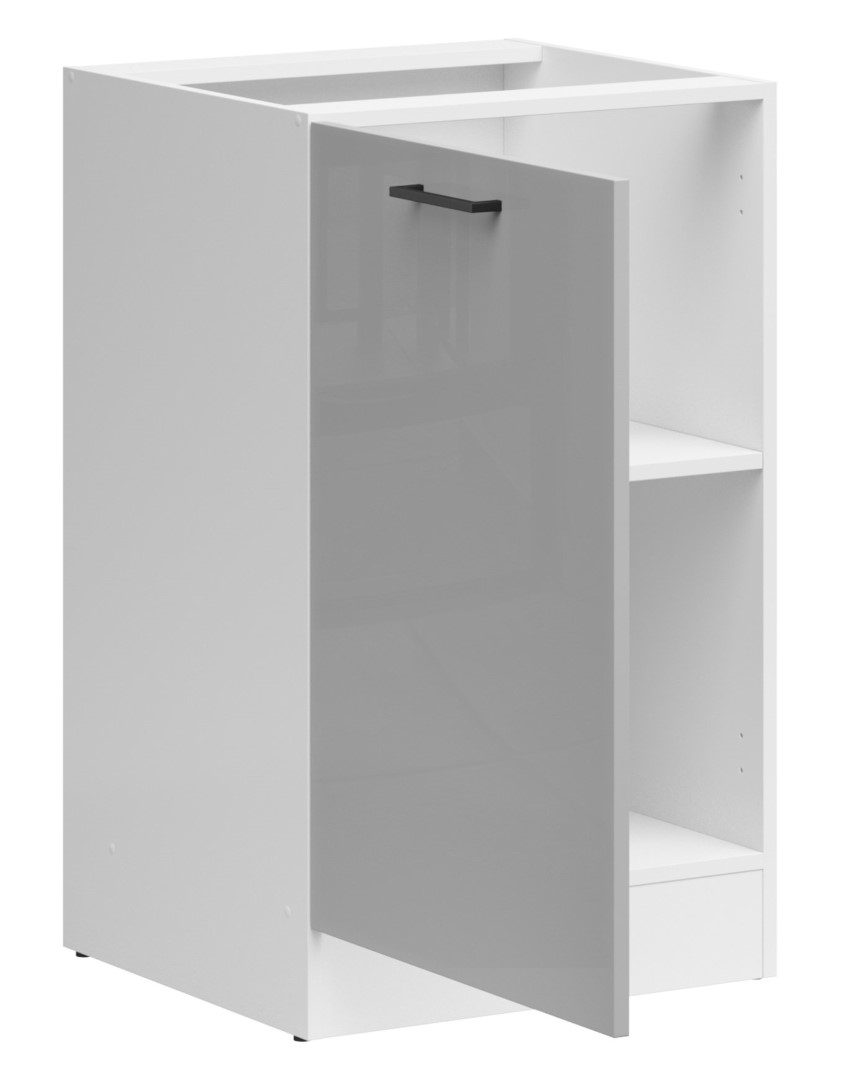 Junona Line Base Cabinet 50x82cm: A practical and stylish kitchen unit that’s perfect for a variety of kitchen spaces. Its practical shelf helps organize kitchen accessories and items by dividing the cabinet’s interior into two sections. This solution makes it easy to separate and store items you use frequently and less frequently. Despite its compact dimensions of 50x82cm, this cabinet is versatile and functional, perfectly fitting even in small kitchens. It’s a left-hand model, with fronts that open to the left. This design makes it an excellent under-counter cabinet, allowing you to store kitchen utensils next to the oven, sink, and wastebasket. This allows you to fully utilize the available space, especially in small kitchens. If you value modern design and functionality, a cabinet from the Junona Line collection is the perfect choice. The white body and light gray gloss fronts give the cabinet a modern and stylish look. Additionally, countertops are available as an option. Kitchen furniture from the Junona Line collection allows for flexible kitchen space arrangement, regardless of its size. You can combine various elements from the collection to tailor the furniture to your individual needs and create a practical and aesthetically pleasing kitchen.