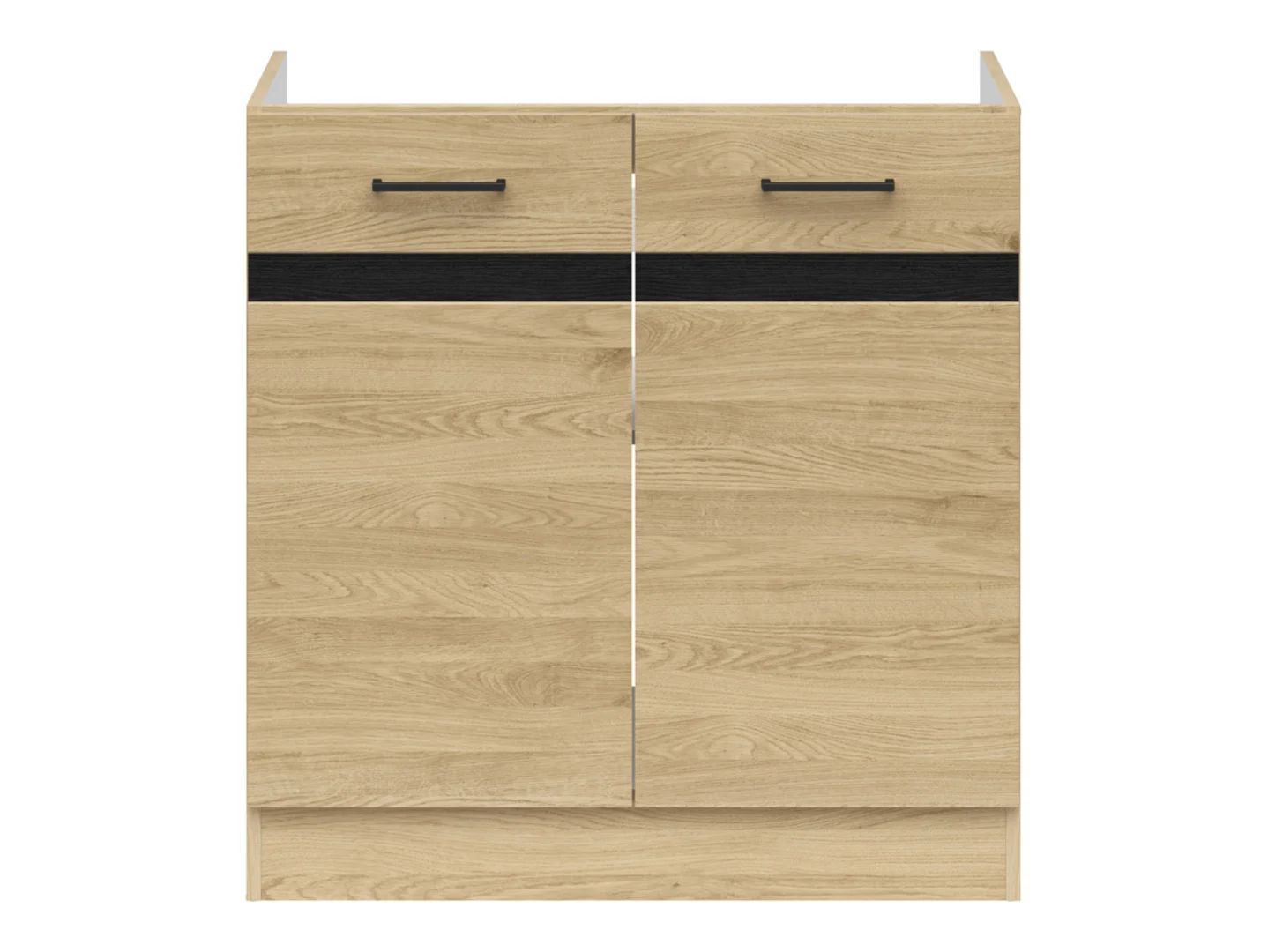 Junona Line 80 Sink Cabinet. An essential kitchen element that helps maintain order and organization in the washing area. Thanks to the cabinet’s carefully designed structure, you can install a two- or single-bowl 80×60 cm overlay sink, or cover the cabinet with a countertop and install any inset sink, increasing the functionality of the washing area. The under-sink cabinet provides ample space for storing dishwashing accessories such as brooms, dustpans, cloths, and waste sorting containers. This makes keeping the kitchen clean easier. Junona Line furniture is distinguished by its modern design, which combines a Bernstein oak body with smooth fronts in the same color with a decorative black insert. Modern black handles complete the look. It’s a stylish choice that can complement a wide variety of kitchen designs.