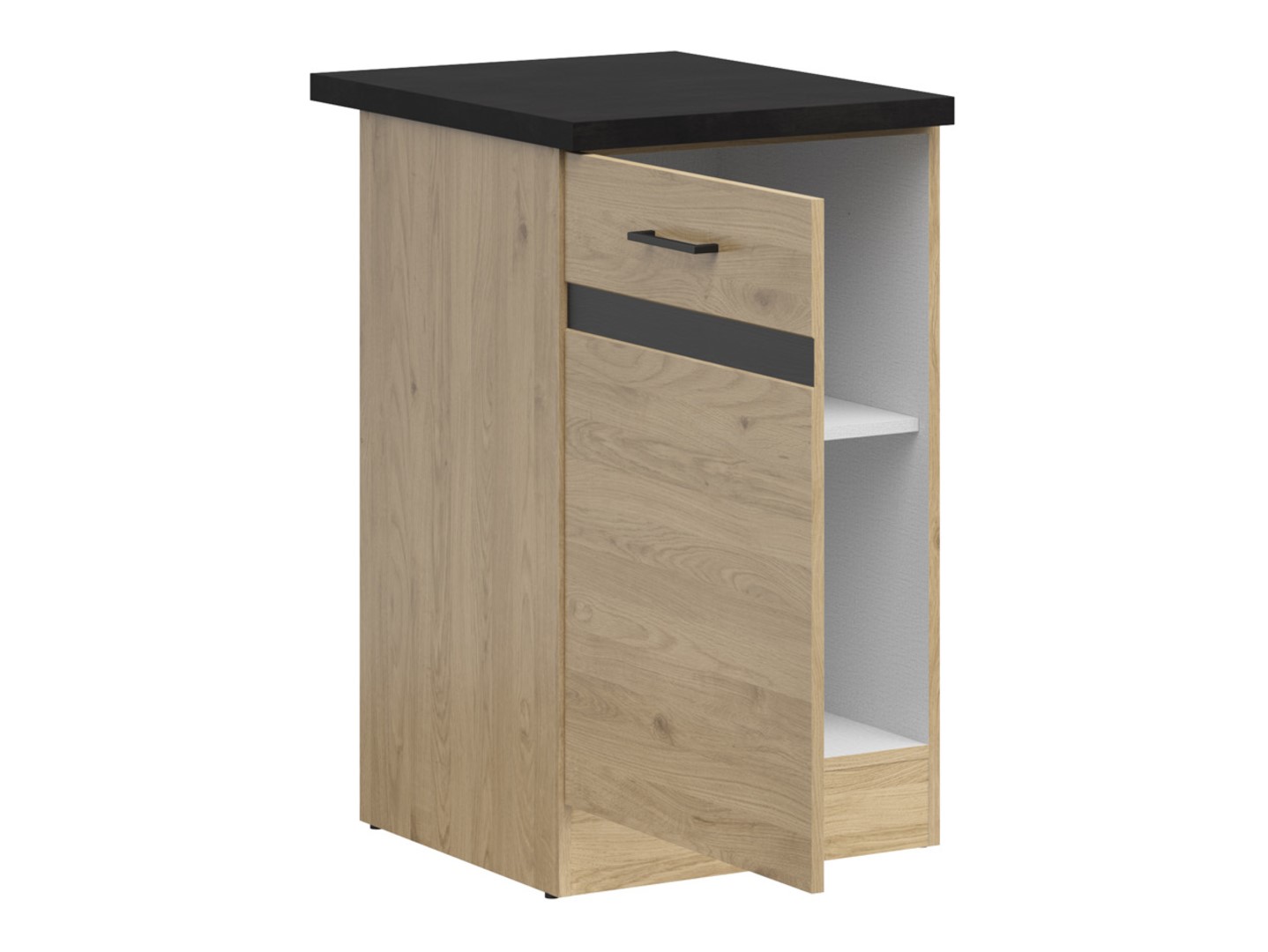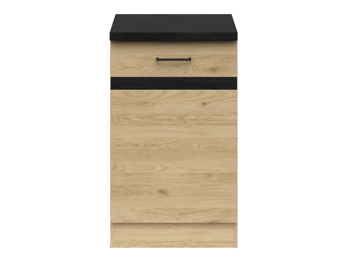The base cabinet features a practical shelf that divides the interior into two sections, allowing you to easily organize kitchen accessories according to your needs. Its optimal dimensions of 50×86 cm make it a perfect fit even in small kitchens, helping you efficiently use the available space next to the oven, sink, and waste bin. The built-in cabinet with a countertop measures 50×60 cm and opens to the left. The cabinet features a minimalist design, with a Bernstein oak body and smooth fronts in the same color with a decorative black insert. The contrasting black-gold metallic slate countertop adds elegance. Furthermore, the cabinet features a timeless, simple black handle that not only facilitates opening but also adds character. Other elements of the Junona Line collection and accessories are available at emkameble.pl. Modular kitchen furniture is a solution not only for small but also for larger kitchens. Combine the base cabinet with other elements from the Junona Line collection and create a set tailored to your needs.
