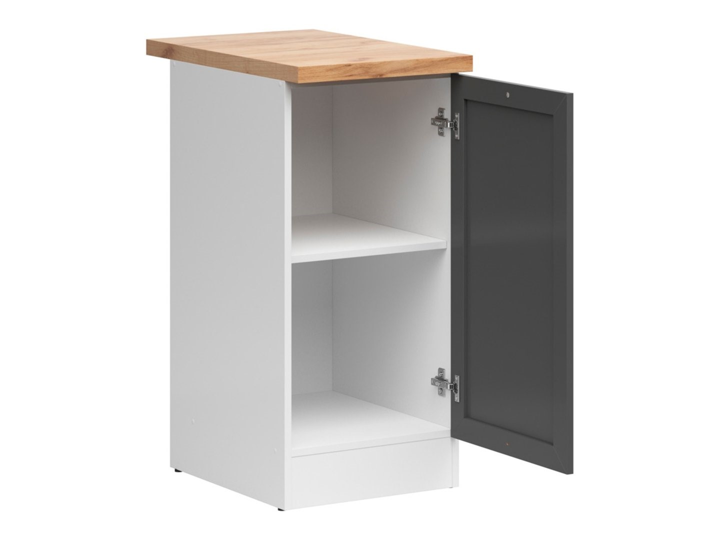 The Junona Line base cabinet with countertop is perfect for those who desire a functional kitchen. The base cabinet features a practical shelf that divides the interior into two sections, allowing for easy organization of kitchen accessories according to the user’s needs. Its optimal dimensions of 40×86 cm make it a perfect fit even in small kitchens, helping to efficiently utilize the available space next to the oven, sink, and waste bin.