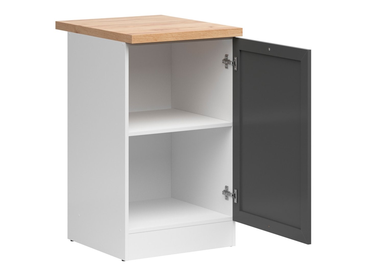The Junona Line base cabinet with countertop is perfect for those who desire a functional kitchen. The base cabinet features a practical shelf that divides the interior into two sections, allowing for easy organization of kitchen accessories according to the user’s needs. Its optimal dimensions of 50×86 cm make it a perfect fit even in small kitchens, helping to efficiently utilize the available space next to the oven, sink, and waste bin.