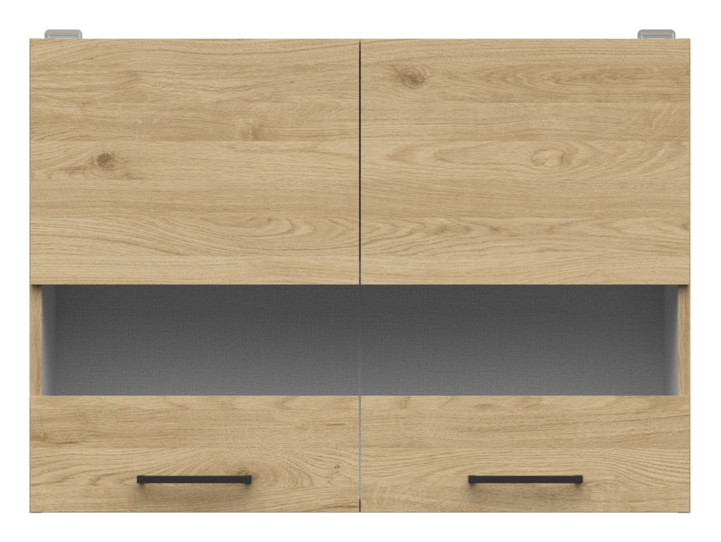 Junona Line 80 cm Upper Cabinet with Display Case. A practical and aesthetically pleasing solution for your kitchen. This cabinet is ideal for showcasing your dishes or kitchen decorations. The glass panel allows you to display the tableware that looks its best. The 80×57 cm upper cabinet with display case can be placed above a base cabinet of the same width or above two 40 cm wide cabinets. This allows for flexible kitchen layout adaptation to individual needs and available space. The Junona Line upper cabinet with display case features a modern and elegant finish. The Bernstein Oak body and fronts add a natural charm, while the glass insert adds a touch of lightness. The glazed doors are enhanced by a glass shelf with LED lighting, which can be purchased as an optional accessory. This adds shine and highlights the beauty of stored items.