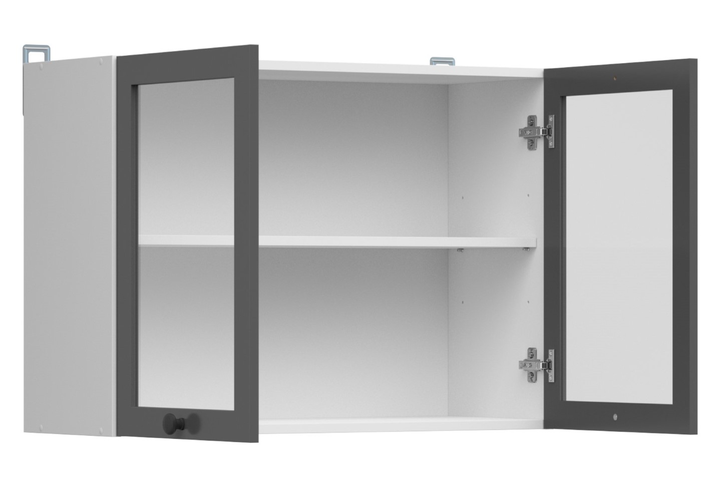 An upper cabinet with a display cabinet from the Junona Line collection. A practical and aesthetically pleasing solution for your kitchen. This cabinet is perfect for showcasing your dishes or kitchen decorations. The glass front allows you to display the most beautiful tableware. The remaining items can be hidden behind closed fronts, keeping your kitchen tidy. The 80×57 cm upper cabinet with a display cabinet can be placed above a base cabinet of the same width or above two 40 cm wide cabinets. This allows for flexible kitchen layouts to suit individual needs and available space. The Junona Line collection is distinguished by its modern and elegant finish. The white body is subdued, while the graphite front adds warmth and natural charm. The glazed doors are enhanced by an optional glass shelf with LED lighting, which can be purchased separately. This adds shine and highlights the beauty of stored items.