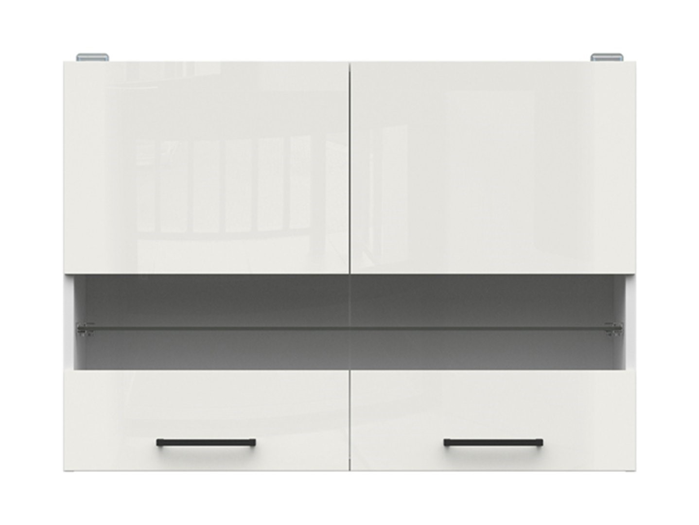 An upper cabinet with a display cabinet from the Junona Line collection. A practical and aesthetically pleasing solution for your kitchen. This cabinet is perfect for showcasing your dishes or kitchen decorations. The glass front allows you to display the most beautiful tableware. The remaining items can be hidden behind closed fronts, keeping your kitchen tidy. The 80×57 cm upper cabinet with a display cabinet can be placed above a base cabinet of the same width or above two 40 cm wide cabinets. This allows for flexible kitchen layouts to suit individual needs and available space. The Junona Line collection is distinguished by its modern and elegant finish. The white body is subdued, while the chalk-gloss front adds warmth and natural charm. The glazed doors are enhanced by an optional glass shelf with LED lighting, which can be purchased separately. This adds shine and highlights the beauty of stored items.