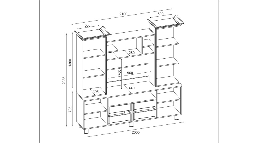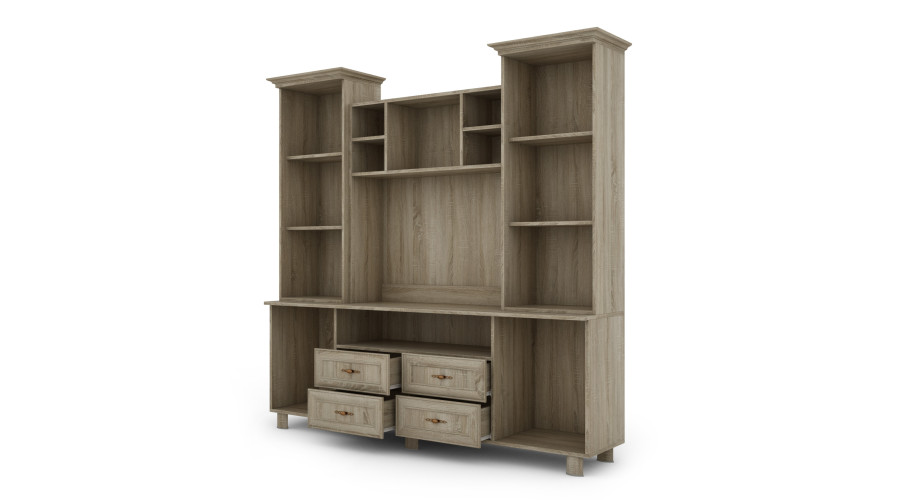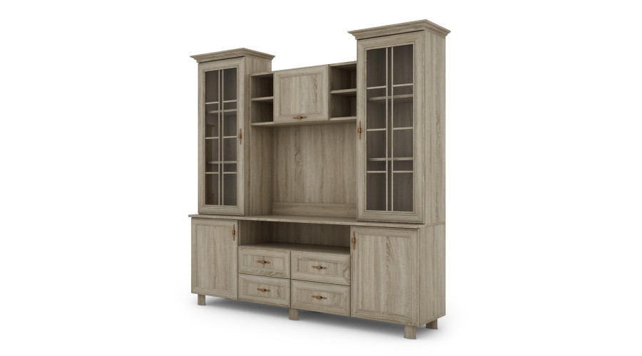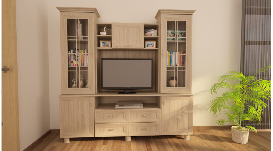 The central section features a recess with openings for cable management and aesthetics around the equipment. Glazed sections with shelves for displaying books, glassware, or decorative items are located on the sides, while lower cabinets allow for storage of equipment and accessories out of sight. This division enhances the clarity of the TV area and facilitates organization.