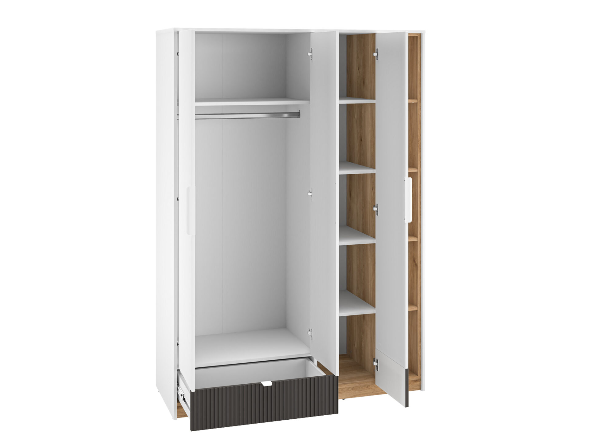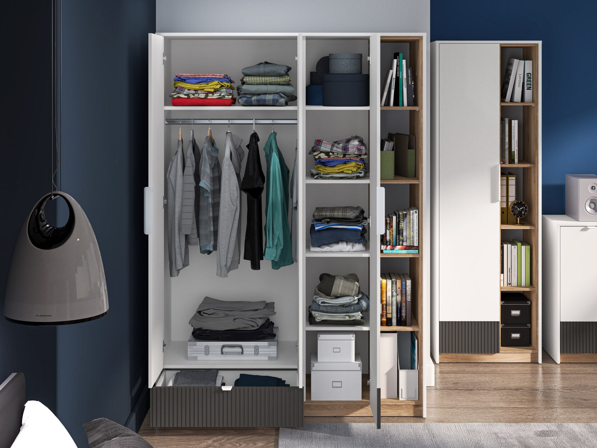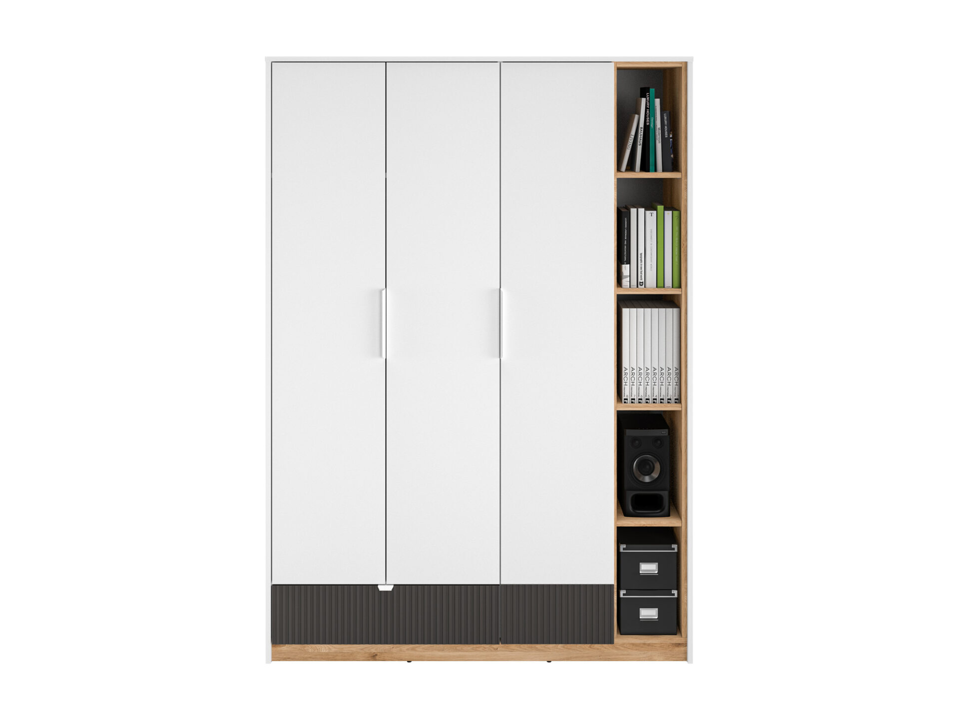 The Torino 01 three-door wardrobe provides ample storage space. The spacious space behind the triple doors features a convenient hanging rail, a large shelf, and a lower drawer, allowing for ample storage. The second section of the wardrobe features convenient, lockable shelves. Five spacious niches ensure that all of a teenager’s clothing finds its place. The next section features five additional open shelves, perfect for displaying books and other favorite items. The furniture’s original design and dynamic combination of décor accentuate the individual style and character of young people.