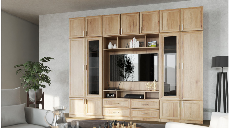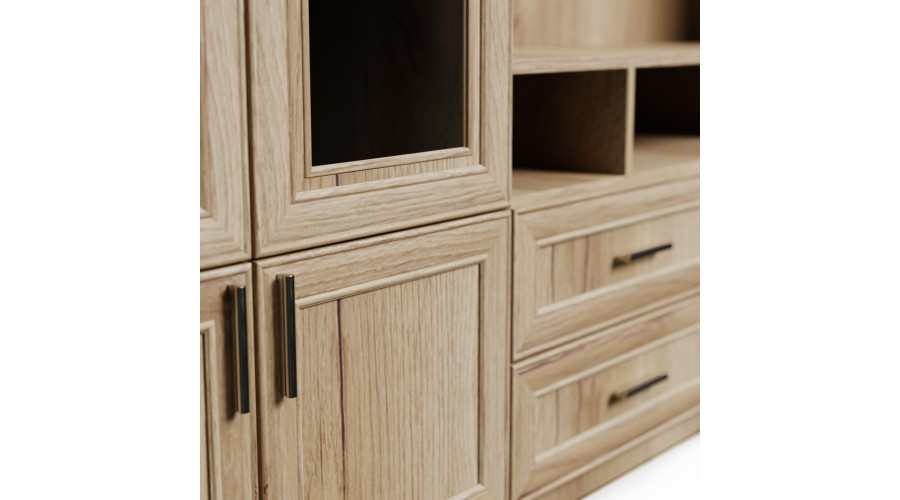 A well-thought-out TV area provides convenient space for a TV and multimedia equipment, while numerous shelves and lockable cabinets facilitate space organization and storage of everyday items. Glass display cabinets distinguish the VERO model from classic built-ins, allowing you to effectively display decorations, books, or glassware, while giving the entire structure a visual lightness despite its height of up to 240 cm.