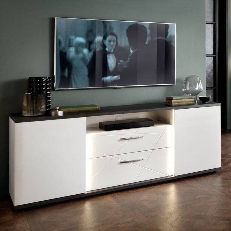 Introducing the elegant Venezia TV stand – the VENF01. This piece of furniture perfectly combines functionality with modern design, creating the heart of home entertainment. Designed for those who appreciate both beauty and practicality, the Venezia VENF01 will complement any tastefully decorated living room. Crafted from the highest quality materials, such as laminated board and MDF, the stand boasts durability and resistance to everyday wear and tear. The body of the unit is made of laminated chipboard, emphasizing the solidity of the construction, while the MDF fronts covered with PVC foil impress with their aesthetics and craftsmanship, while also being easy to clean. The VENF01 offers excellent storage space thanks to its dimensions: width 161.4 cm, height 64.5 cm, and depth 40 cm. It is equipped with two spacious drawers and two doors with a soft-close system, ensuring comfort and peace of mind when using the unit. The additional open shelf is perfect for a set-top box or game console, and special cable holes solve the problem of tangled cables, maintaining order and harmony in the space.
