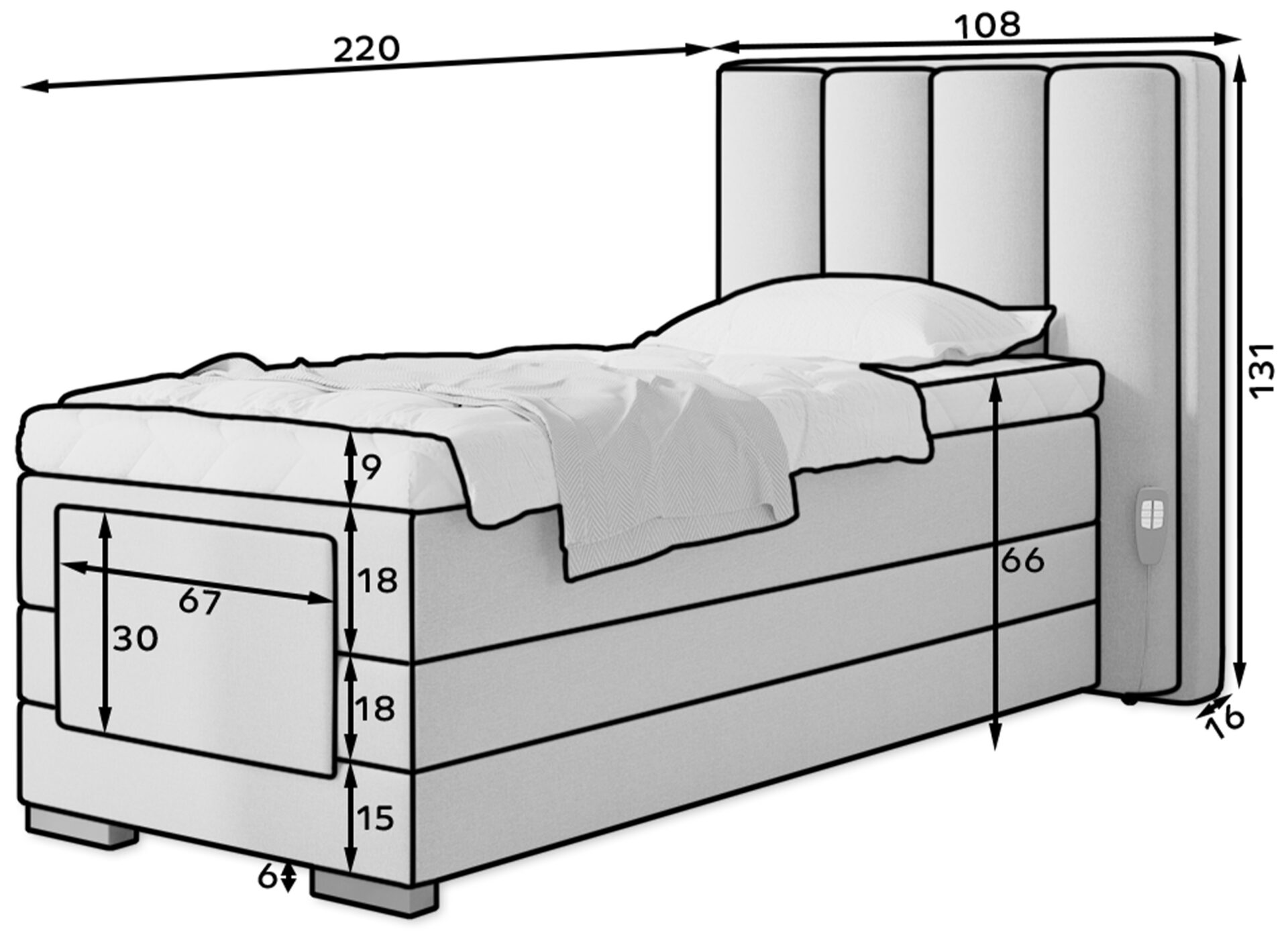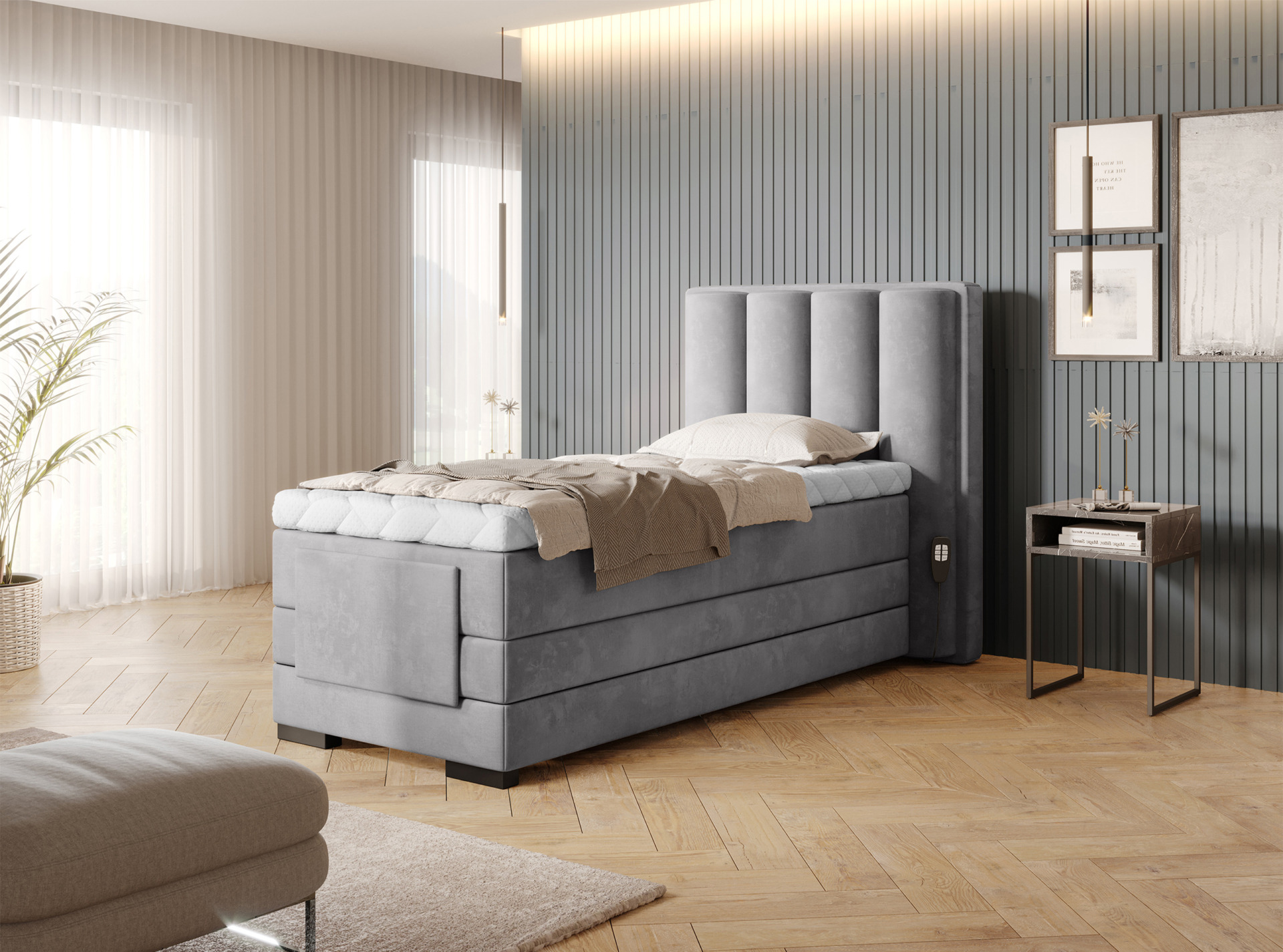 The Veros adjustable electric bed allows you to control your resting comfort to ensure a comfortable and restful night’s sleep. It features a motorized, adjustable frame that allows the user to effortlessly adjust the footrest and headrest. There’s no need to even get out of bed to change the position, as the set includes two remote controls. A single remote control is included with the Veros bed. The Veros bed consists of two main mattresses: a Bonnell spring and a pocket spring, and a mattress topper. The main mattresses provide the ultimate comfort a continental bed can provide. The mattress topper provides excellent protection against stains or damage to the main mattresses. Furthermore, the benefits of toppers include providing additional softness and support during sleep and extending the life of the main mattress. The mattress topper included with the Veros continental bed is protected by a removable, machine-washable Silk cover. The Veros electric bed also makes a great addition to the bedroom. The upholstered back allows you to make the bed the centerpiece of your interior and position it in the center of the room. The versatile black legs easily fit into a variety of bedroom designs. Another advantage that allows you to choose the perfect bed for your bedroom is the availability of our Veros furniture in four sleeping surface sizes: 90/140/160/180 x 200 cm.