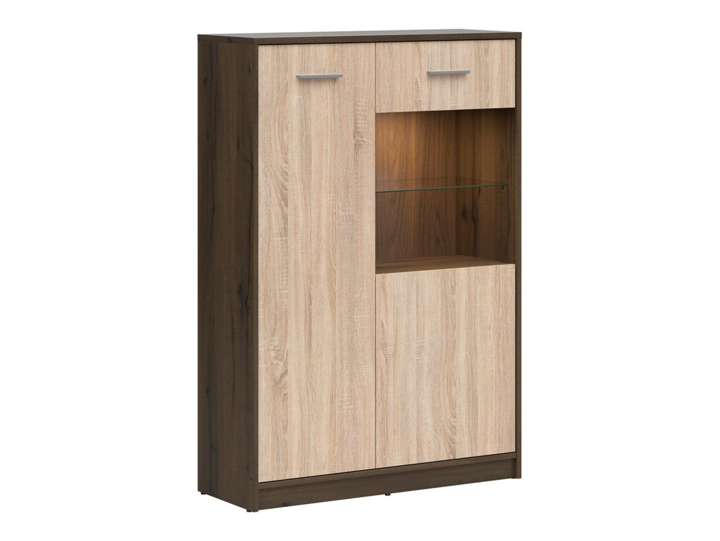 This display cabinet features a classic combination of noble oak color and sonoma oak fronts, which adds harmony and a modern character to any interior. The laminated surface guarantees increased scratch resistance and easy cleaning. Horizontal handles add a minimalist look, while tempered glass ensures durability and safety. Additional LED lighting (optional) will highlight selected decorative elements, creating a cozy atmosphere. Features: Dimensions: width 90 cm, height 131.5 cm, depth 34 cm. Three glass shelves – space for decorations and souvenirs. Two compartments and two dividers – practical storage space. Noble oak color with Sonoma oak fronts – a universal and modern design. Laminated surface – scratch-resistant and easy to clean. Tempered glass – durability and safety. LED lighting (optional) – an additional visual effect. Summary