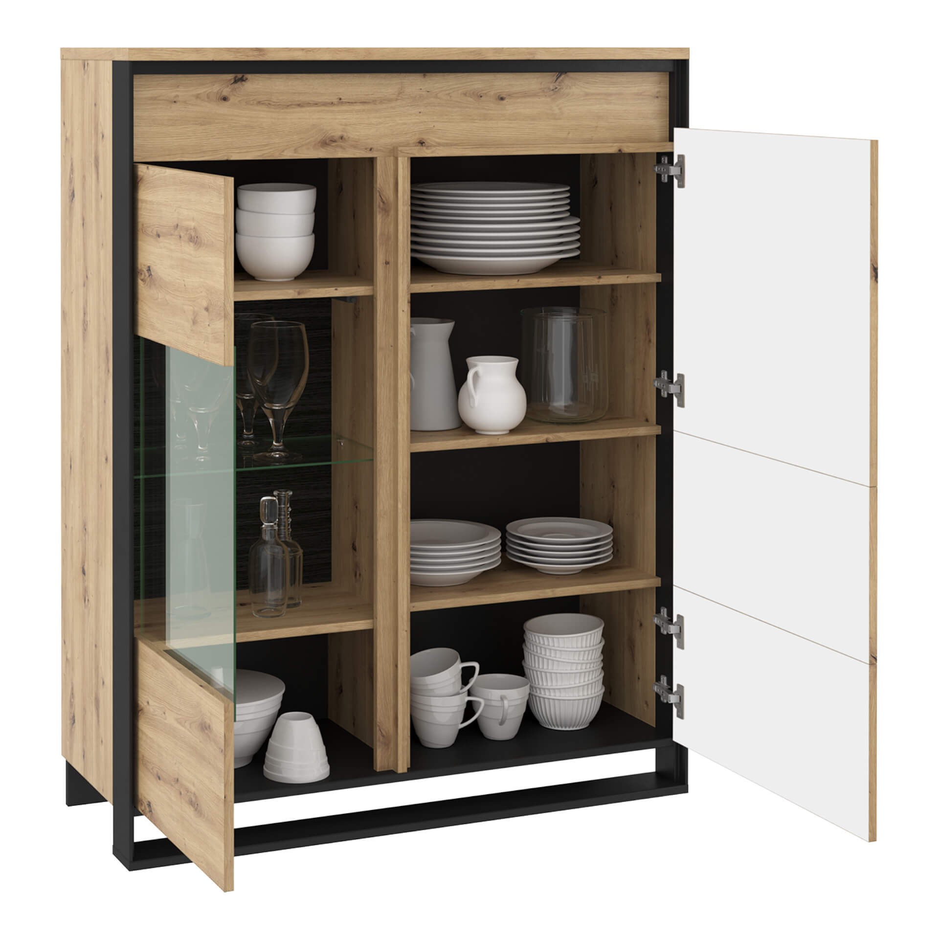 Model: QA-06 Color: artisan oak / black Dimensions: Width: 110cm Height: 140cm Depth: 41cm Basic information: name of the body: QA-06 name of the collection: QUANT body index: Q6DAC colors: artisan oak / black furniture type: display cabinet body characteristics: 1D1W width: 110 cm height: 140 cm depth: 41 cm body weight: 69 kg assembly: requires assembly collection style: modern type of interior 1: living room equipment: 6x shelf number of doors: 2 Fittings: hinge: standard concealed foot / leg: glide with a nail lighting included: yes type of lighting: LED strip Material: body: laminated chipboard: 16mm; 22mm body edge finishing: A 0.45mm body color: black / artisan oak top: laminated chipboard; 22mm top edge finishing: A 0.45mm number of glued top edges: 4 top color: artisan oak back wall: HDF board; 3mm finishing of the visible part of the back wall: laminate finishing of the invisible part of the back wall: laminate back wall mounting: Nuta back wall color: black shelf: laminated chipboard; 16mm shelf edge finishing: A 0.45mm number of glued shelf edges: 1 permissible shelf load: 5kg shelf color: artisan oak number of shelves: 3 glass shelf: tempered glass; 4mm glass shelf color: antisol permissible glass shelf load: 3kg number of glass shelves: 1 front: laminated chipboard; 16mm thick, 16mm MDF board, front edge finish: A 0.45mm, front color: artisan oak, glazed front: tempered glass; 3mm glazed front color: white. Important: This display case is made to order. Order cancellations are not possible after 48 hours of placing your order. Please shop carefully.