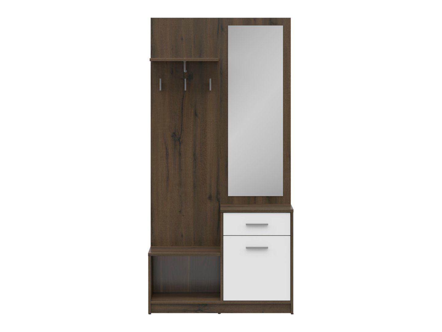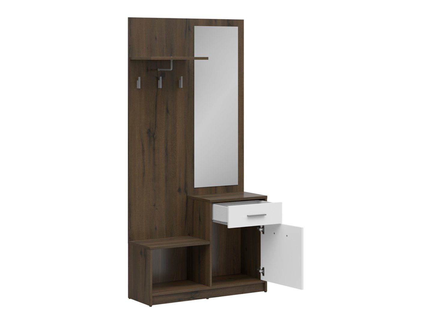 The Nepo Plus unit in noble oak with white fronts stands out with its universal design that complements a variety of interior styles. Horizontal handles facilitate access to the cabinet and drawer, emphasizing the modern character of the furniture. The laminated finish ensures aesthetics and resistance to everyday use, ensuring the furniture maintains its attractive appearance for years to come. Features: Open space – hangers for outerwear. Shoe cabinet – the perfect place to store footwear. Handy drawer – for small items like keys or documents. Top shelf – for hats, scarves, or accessories. Mirror – a practical element for a quick check before leaving. Noble oak/white color scheme – a modern and universal look. Laminated surface – durability and easy cleaning. Horizontal handles – convenience and an aesthetic accent. Summary