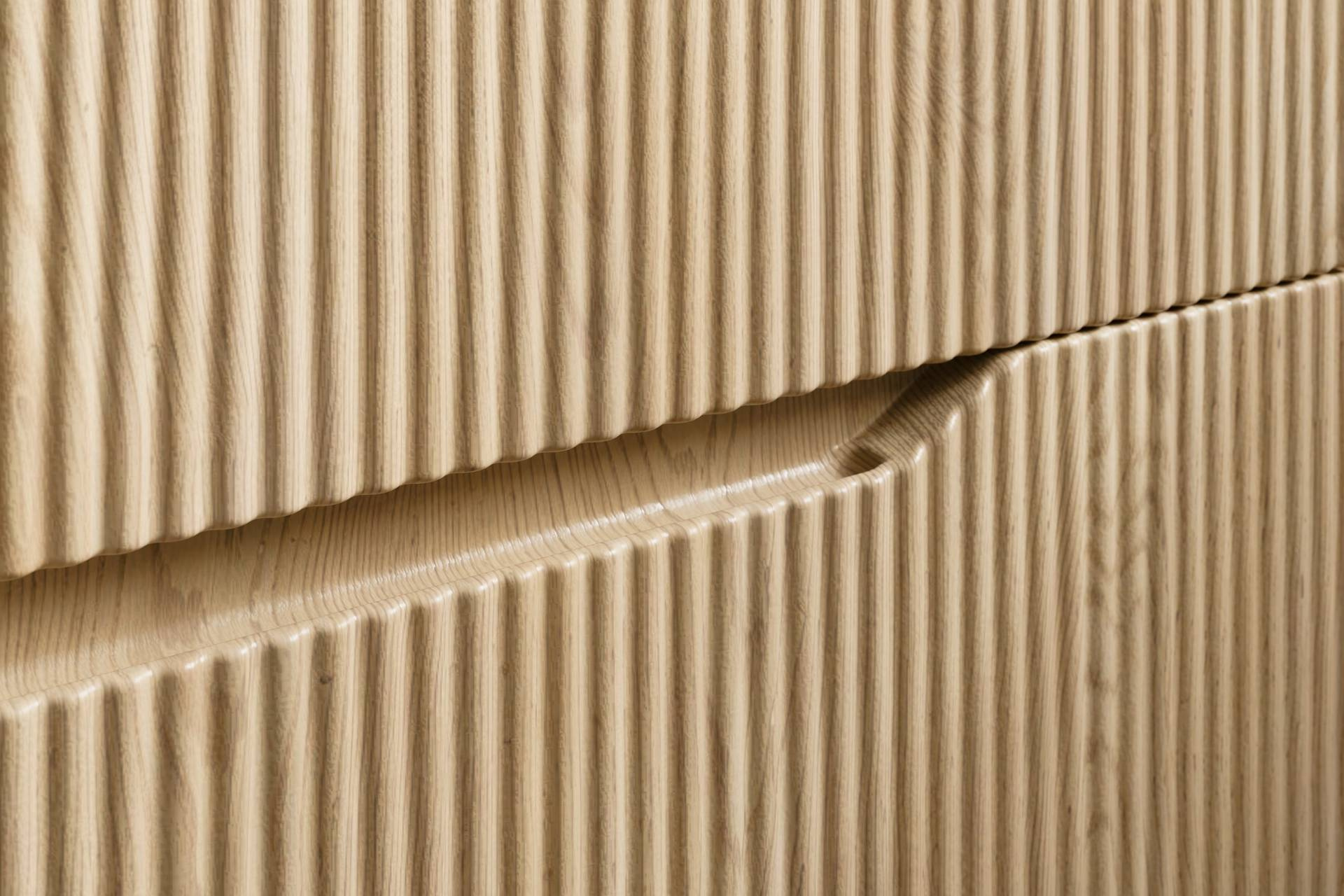 The 2-door tall column cabinet from the same collection is the perfect solution for additional storage. Offering four shelves and a compact design, it allows for easy organization of cosmetics, towels, and cleaning products. Its modern design and natural finish create a cohesive aesthetic with the vanity unit, giving the entire set an elegant and modern feel.