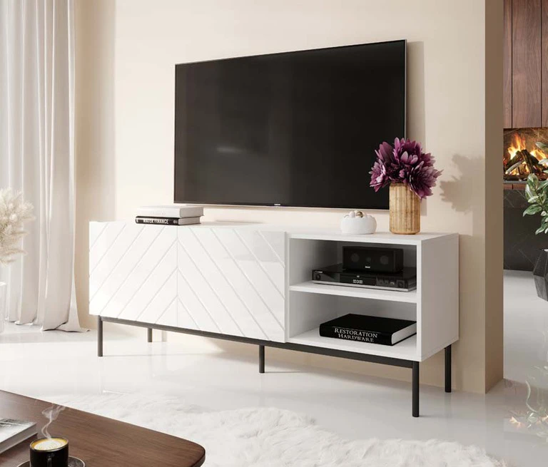 ABETO 150 televizoriaus spintelė išsiskiria frezuotais „eglutės“ rašto fasadais, kurie pati savaime yra dekoratyvinis elementas. Visas baldas pastatytas ant modernaus juodo arba auksinio rėmo. ABETO televizoriaus spintelė – puikus pasirinkimas moderniam, tačiau jaukiam interjerui.