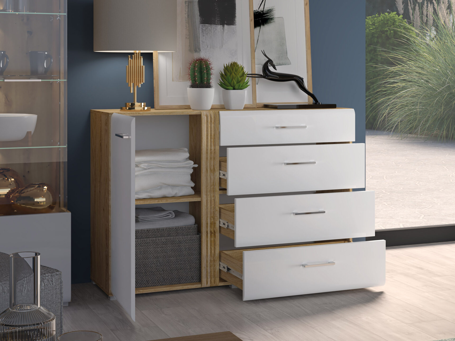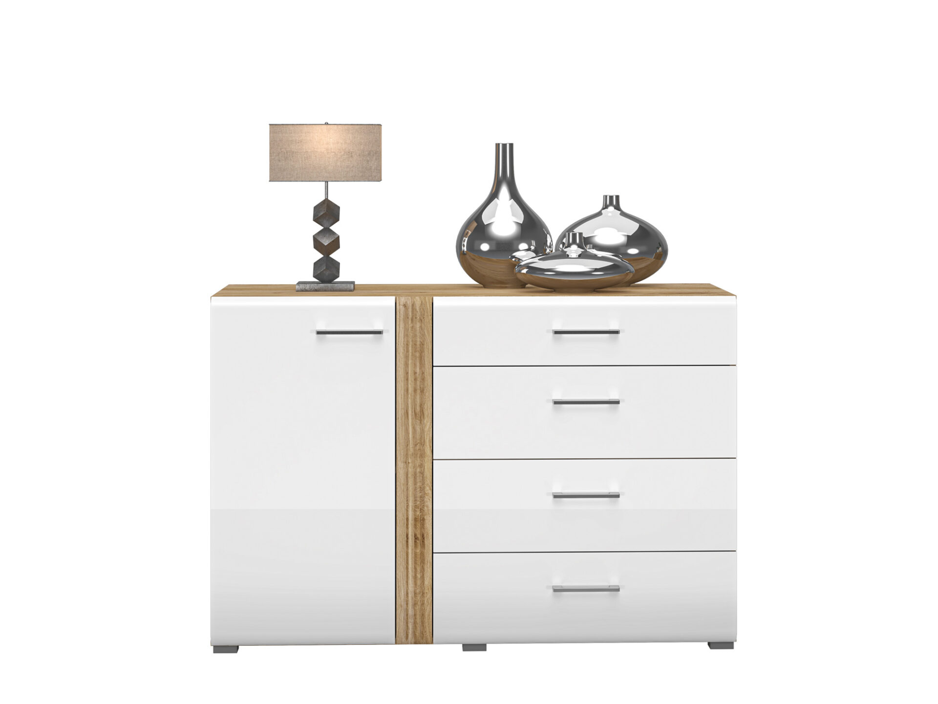 „Adagio 04“ indauja yra ne tik erdvus baldas, bet ir suteikia papildomos vietos mėgstamiausiems daiktams eksponuoti ant didelio stalviršio. Už durelių yra lentyna, padalijanti uždarą erdvę į du erdvius skyrius. Keturi dideli stalčiai su sutvirtintais dugnais suteikia daug vietos rankšluosčiams, drabužiams ir kitiems tekstilės gaminiams. Ši indauja puikiai papildo svetainę ar miegamąjį. Šis baldas derina funkcionalumą ir gerą dizainą. Apvalūs MDF fasadai, giliai frezuoti lipdiniai, atitinkantys korpuso spalvą, bei metalinės ir chromuotos rankenos – tai „Adagio“ kolekcijos esmė.