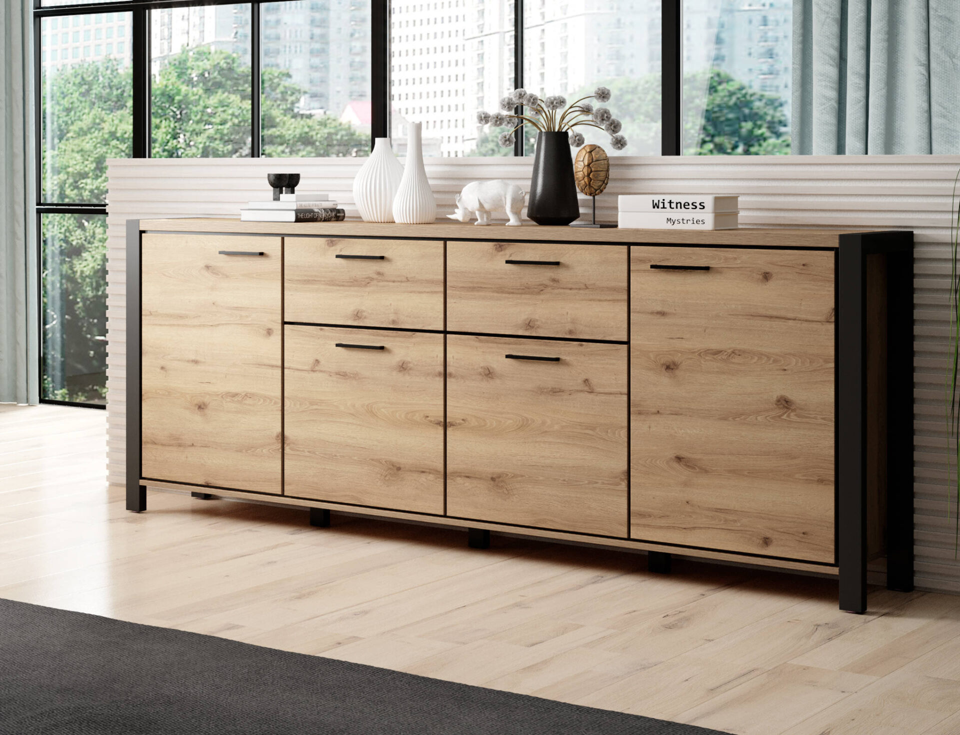 Pristatome „Aktiv 4D2S Taurus ąžuolo / juodų kojų komodą“ – baldą, kuris pakeis bet kokį šiuolaikinį interjerą. Ši įspūdinga „Helvetia“ „Aktiv“ kolekcijos komoda yra modernaus elegancijos, rafinuoto dizaino ir patikimo funkcionalumo sinonimas, pasiruošusi tapti jūsų namų traukos centru. Kruopščiai suprojektuota tvirta „Aktiv“ konstrukcija užtikrina, kad ši komoda yra ne tik daiktų laikymo vieta, bet ir išskirtinis dizaino elementas. Drąsus „Taurus ąžuolo“ spalvos ir kontrastingų juodų kojelių derinys traukia akį ir suteikia jūsų interjerui gaivumo. Nesvarbu, ar ieškote praktiško sprendimo savo svetainei, miegamajam ar jaunimo kambariui, ši komoda bus kaip tik tai, ko jums reikia. „Aktiv“ komoda pagaminta iš aukštos kokybės baldinės plokštės, kuri dėl savo konstrukcijos garantuoja atsparumą drėgmei ir dėmėms – idealiai tinka tiems, kurie vertina patvarumą ir lengvą priežiūrą. Praktiškumas yra pagrindinis šio baldo žodis: keturios durelės atveria keturias erdvias lentynas, o du stalčiai su pilno ištraukimo rutuliniais guoliais leidžia lengvai pasiekti laikomus daiktus.