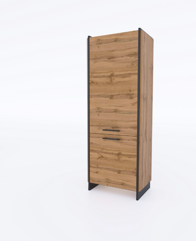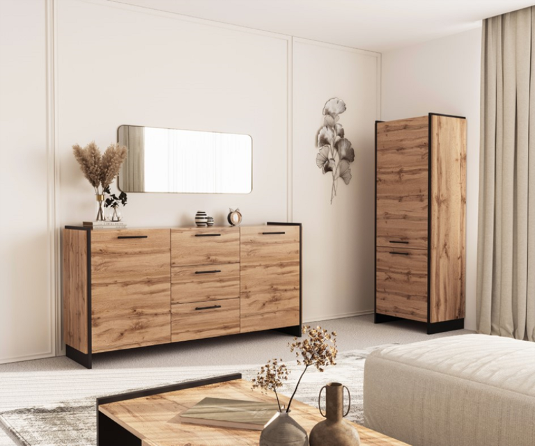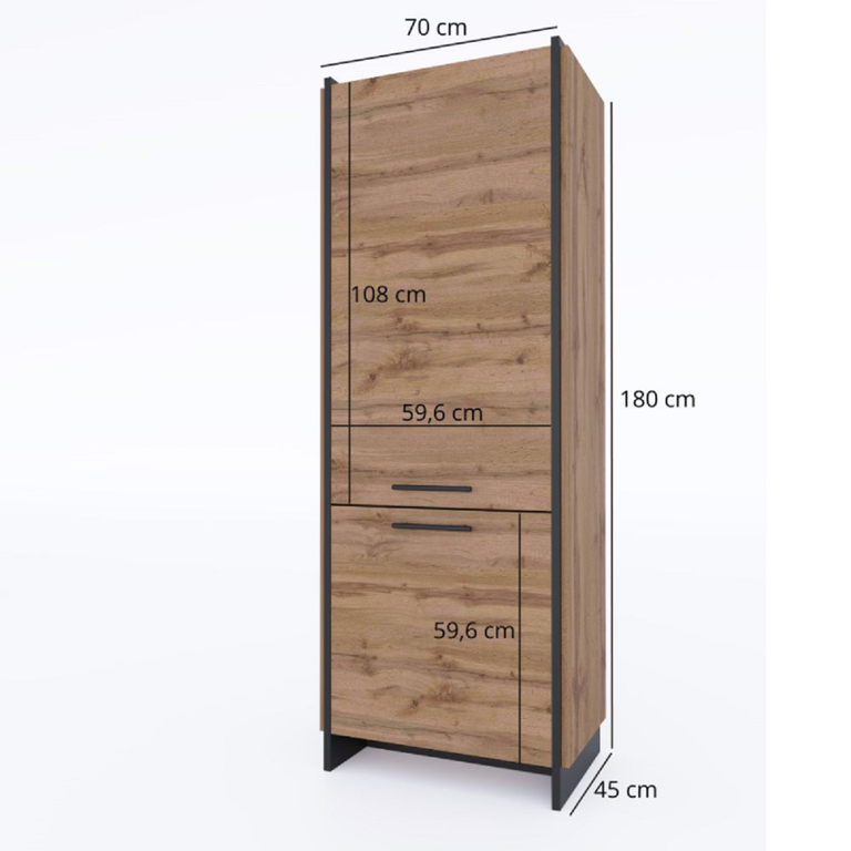 Modernus dizainas: šilto Wotano ąžuolo atspalvio ir kontrastingos juodos spalvos derinys suteikia šiam baldui unikalų charakterį.