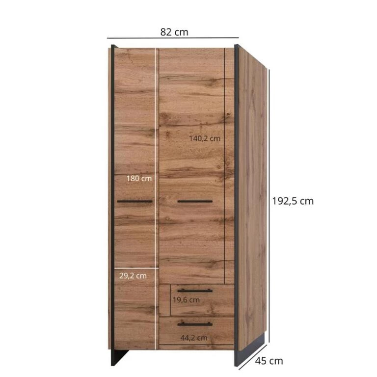 Kolekcija: AMINO Surinkti baldai: Ne Plotis: 82 Aukštis: 192,5 Gylis: 45 Durų skaičius: 2 Stalčių skaičius: 2