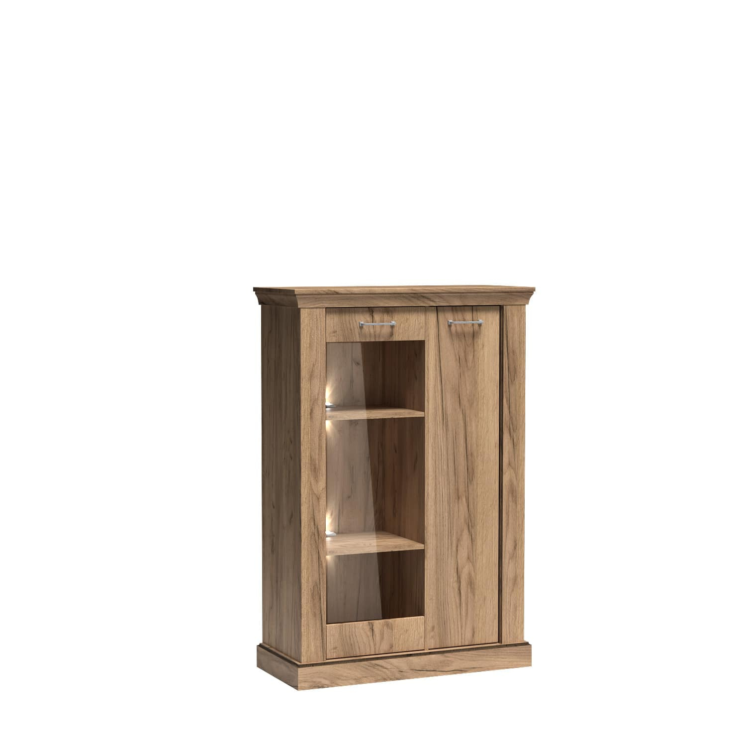 ’Antica-12“ vitrina pasižymi minimalistinėmis linijomis ir klasikinėmis spalvomis, todėl puikiai tinka tiek moderniam, tiek tradiciniam interjerui. „Kraft Gold“ spalvų gama sukuria prestižą ir prabangą, o sidabro atspalvio metalinės rankenėlės subtiliai pabrėžia šį efektą. Šis baldas bus ne tik funkcionalus, bet ir ryškus dekoratyvinis elementas jūsų svetainėje ar valgomajame. Spintelės viduje yra dvejos durys – vienos tvirtos, kitos su elegantišku grūdinto stiklo priekiu. Tai leidžia stilingai eksponuoti mėgstamus aksesuarus ir dekoracijas, kurios tikrai pritrauks svečių dėmesį. Šis sprendimas ne tik pagerina estetiką, bet ir sukuria harmoningą pusiausvyrą tarp atvirų ir uždarų detalių. „Antica-12“ vitrina taip pat yra neįtikėtinai praktiška – dvi lentynos viduje leidžia susitvarkyti įvairius daiktus – nuo knygų iki stiklinių, todėl spintelė yra ne tik gražus priedas, bet ir funkcionalus sprendimas kasdieniame gyvenime. Be to, švelniai užsidarančios durelės garantuoja komfortą, pašalindamos nemalonų uždarymo girgždėjimą. Tai paverčia durelių naudojimą tikru malonumu.